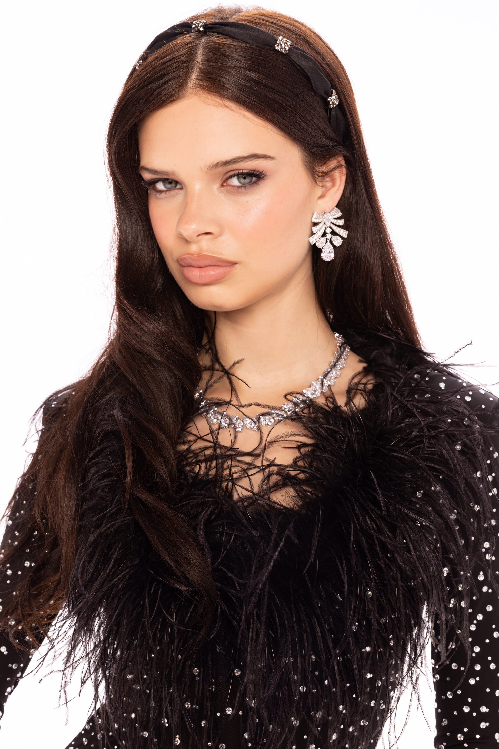 The Margot Diamond Mini Dress captures the magic of the night sky. This sparkly black evening dress, crafted from stretch knit wool, shimmers with thousands of hand-placed diamonds that trace the body like a constellation. The deep V-neckline and mid-thigh hem sculpt a sensual silhouette, while dramatic ostrich feathers at the neckline and cuffs transform this long sleeve mini dress into a truly unique dress.