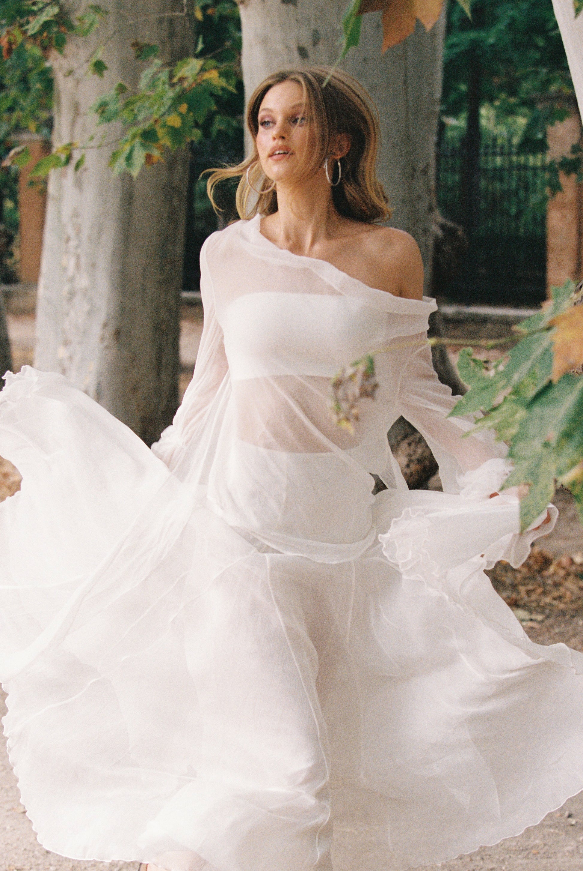 The Nora Top is a sheer georgette blouse that blends romantic elegance with modern versatility. Featuring a flowing swing neckline and soft ruffle sleeves, this black mesh top drapes effortlessly for a light, airy feel. The adjustable waist tie cinches the silhouette, while the included matching tube top offers coverage without sacrificing style. Designed for multiple looks, it can be worn off-the-shoulder for evening allure or one-shoulder for a chic daytime statement.