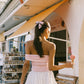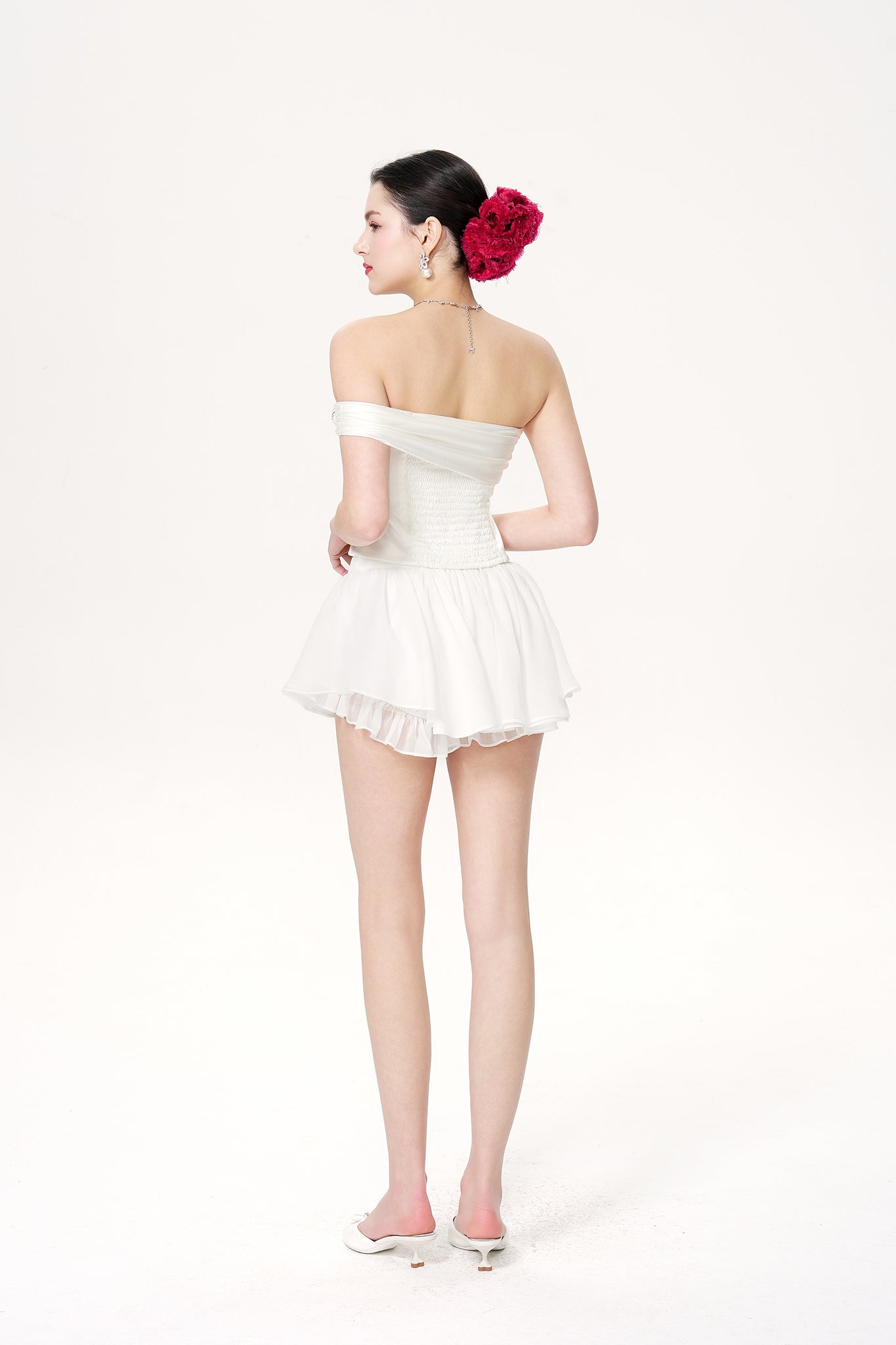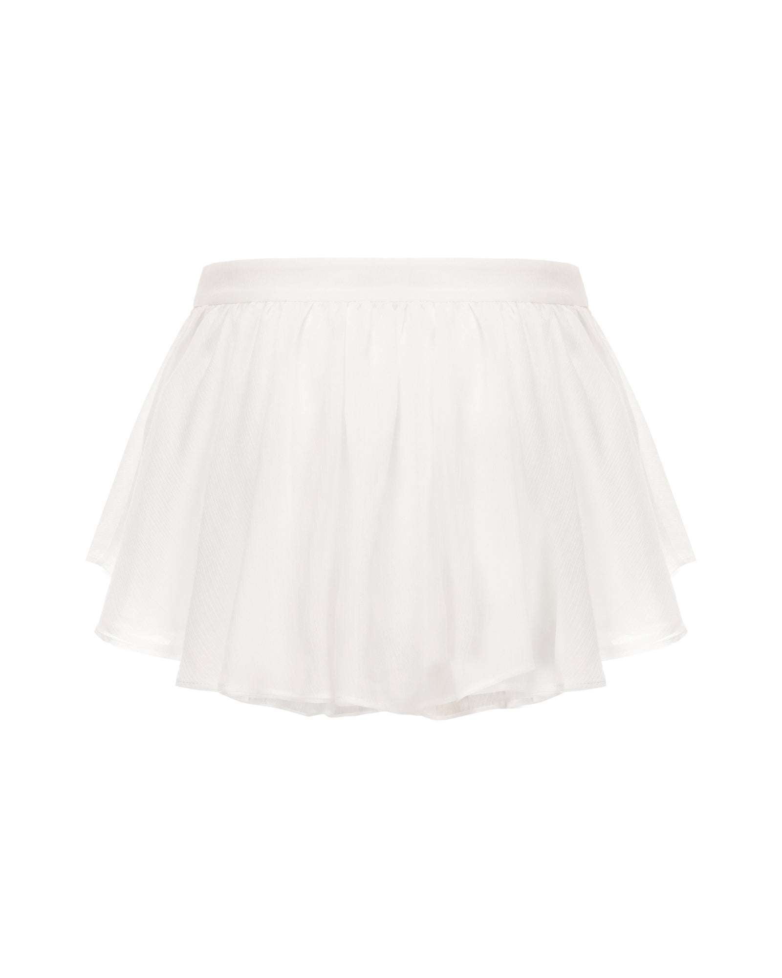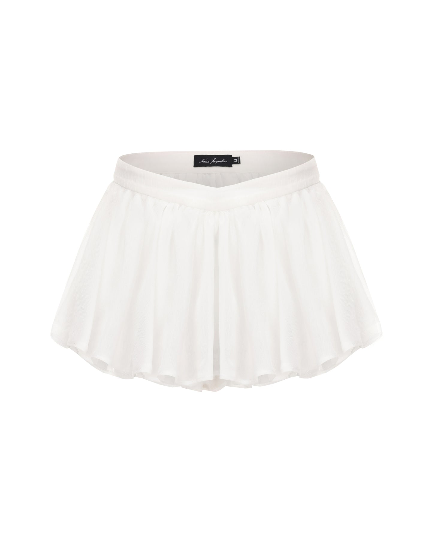 The Rosaline Skirt floats like mist, with a semi-sheer texture that reveals soft motion and subtle allure. The umbrella-shaped silhouette drapes gracefully over the body, while cascading ruffles mimic petals dancing in the breeze. A V-shaped waistband sits delicately at the waist, cinching the figure and creating a flattering, feminine shape. With every step, the layered hem sways in airy elegance, exuding dreamy charm.