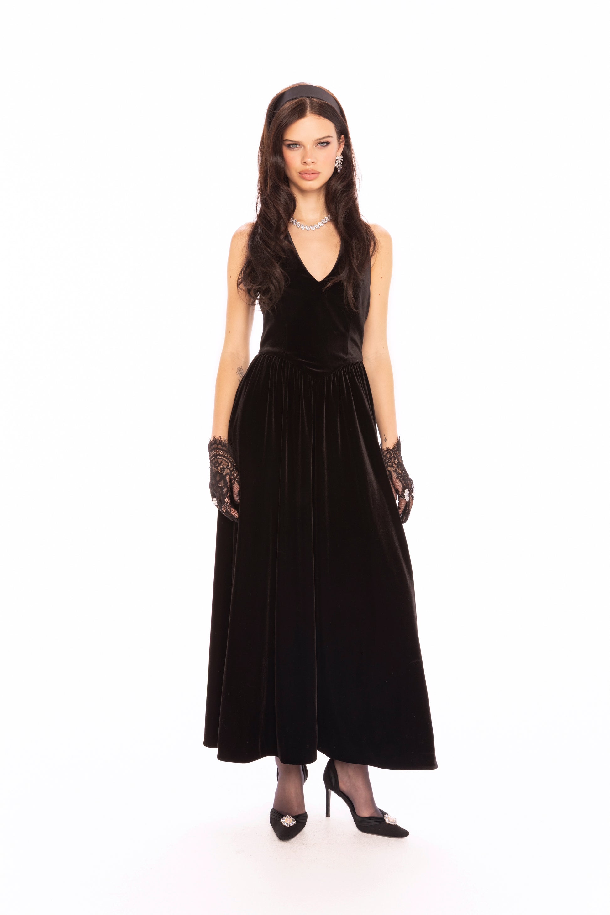 • Material: Stretch black velvet with a soft sheen and luxurious touch.