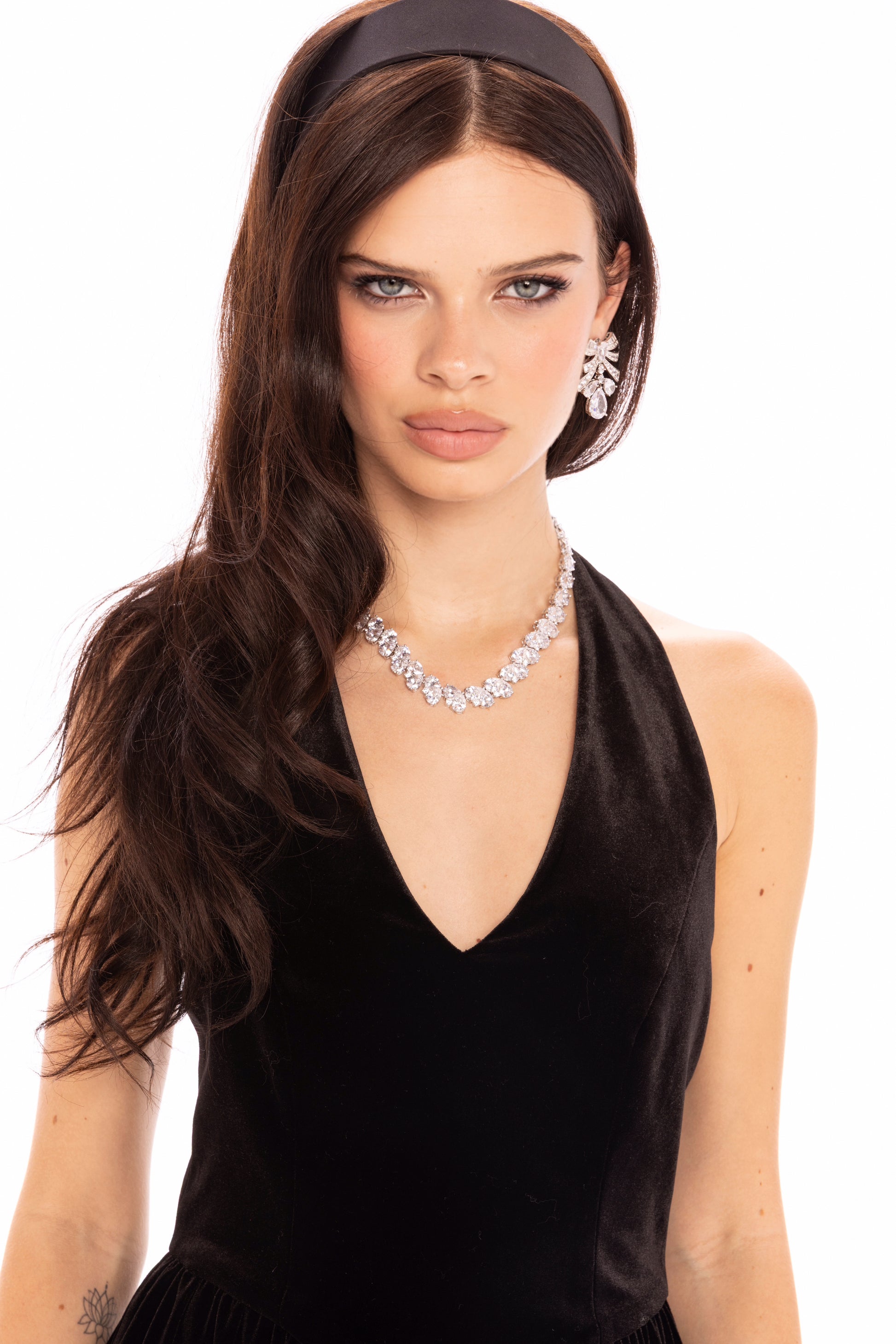 • Design: Long velvet halter dress blending sophistication and ease.
