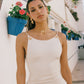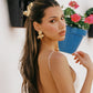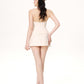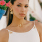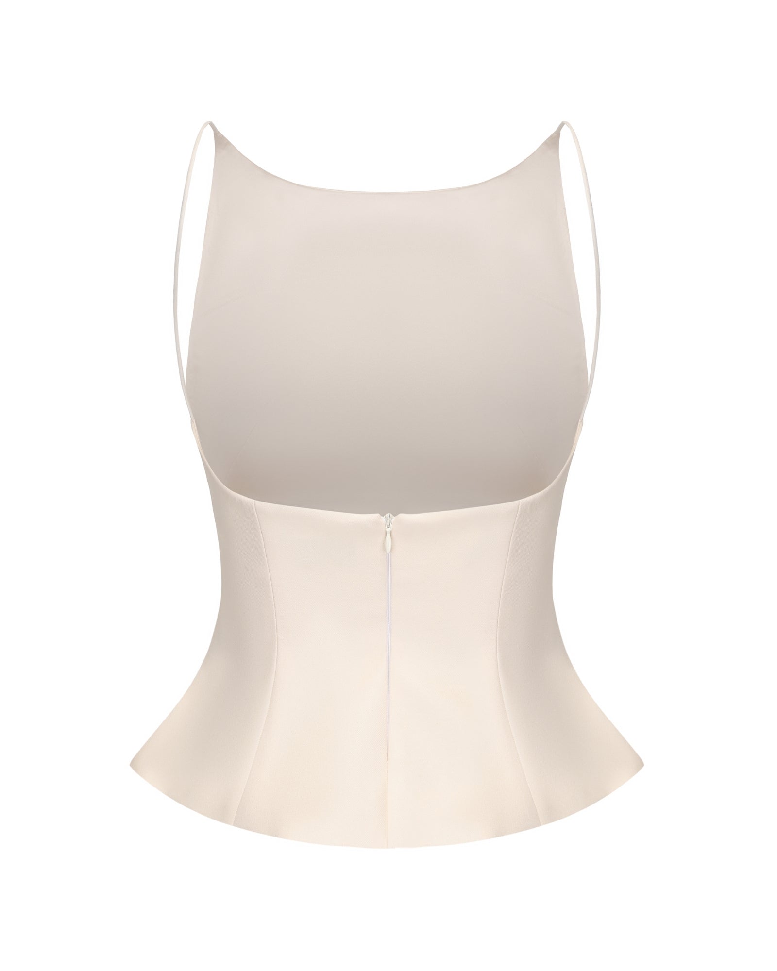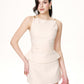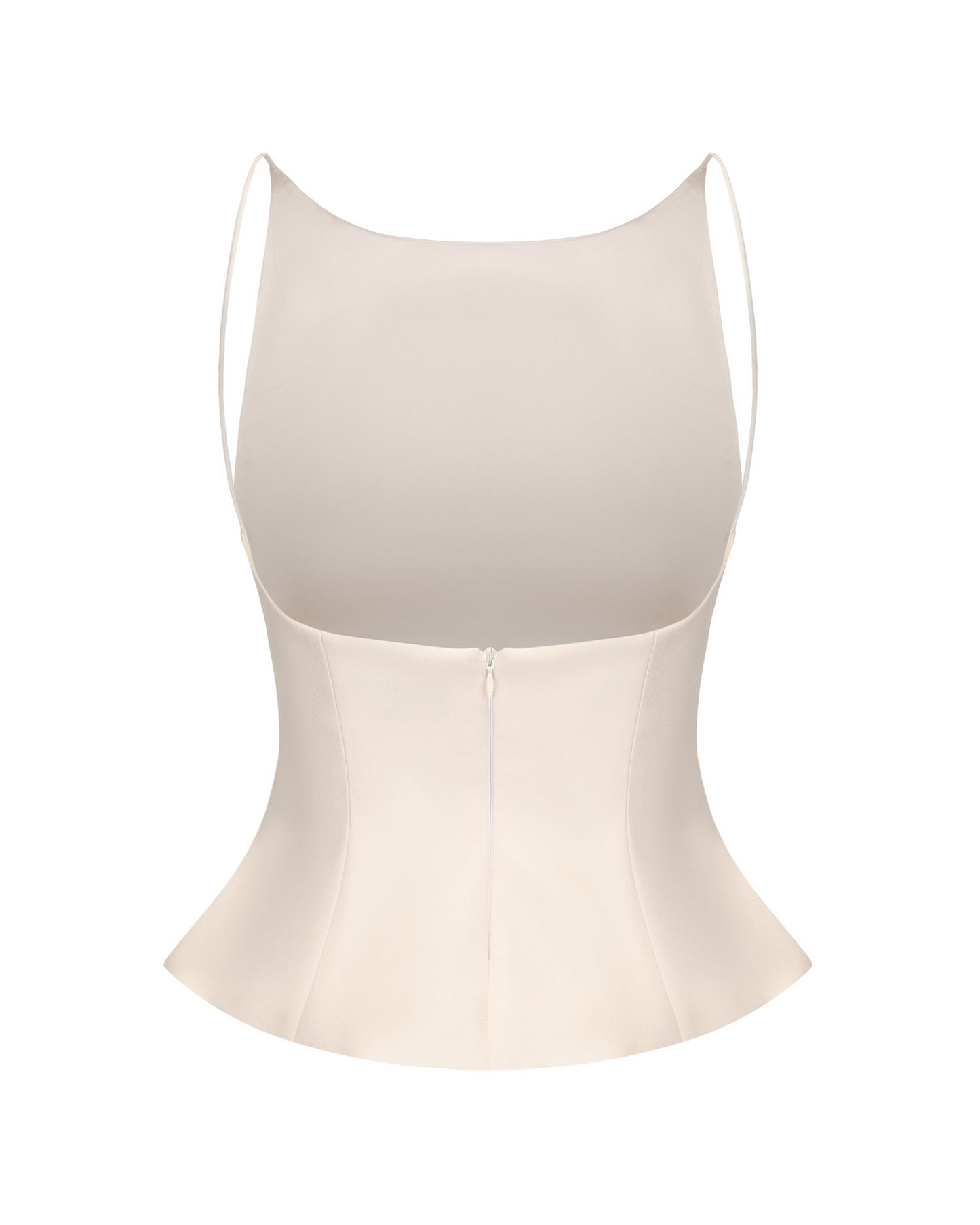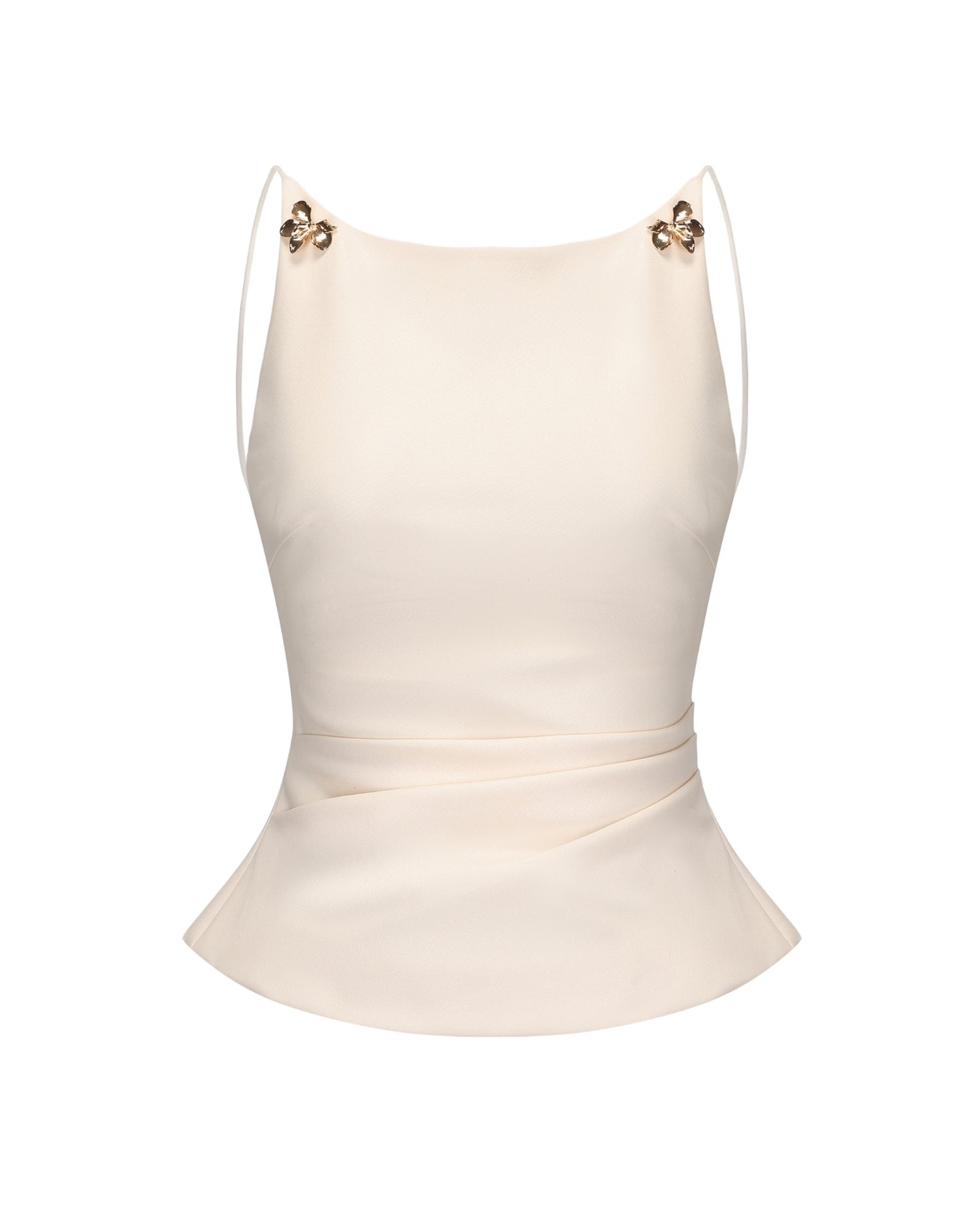 The Selena Top captures romantic elegance in a shimmering beige fabric that glows like soft morning light. The high round neckline flatters the collarbone, while golden flower buttons on each shoulder add a vintage touch of charm. Asymmetric pleats at the waist sculpt the silhouette, and the flying hemline moves like petals in a spring breeze. The subtle backless design adds a whisper of allure to this dreamy, feminine piece.