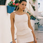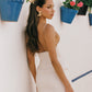 Back: Hidden zipper with golden hook; subtle open-back design.