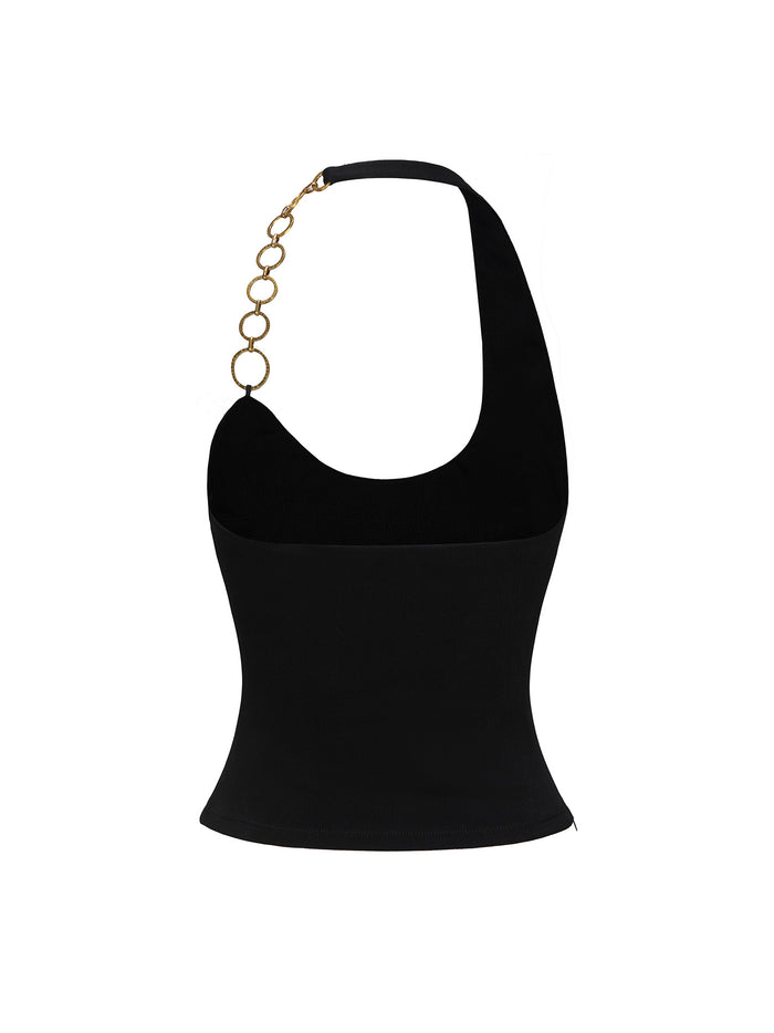 A highlight of this top is the gradient metal ring design, gracefully encircling the slender neck with a visual appeal. Connecting to a section of fabric at the back ensures comfort. The waist design and slightly open hem accentuate the wearer's graceful figure, offering a slimming effect with a playful touch.