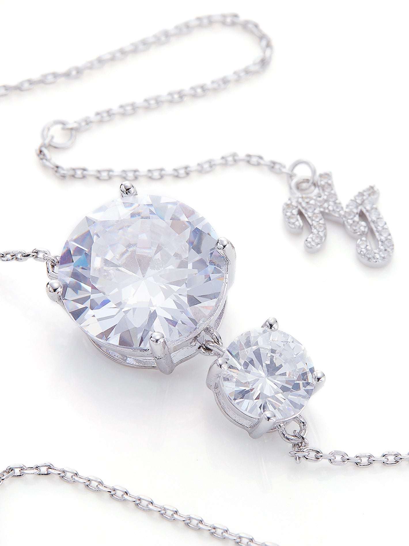 Nadine Necklace: A minimalist clavicle chain adorned with two round diamonds and a delicate blend of large and small zircons, creating a graceful sparkle that rests gently along your collarbone.