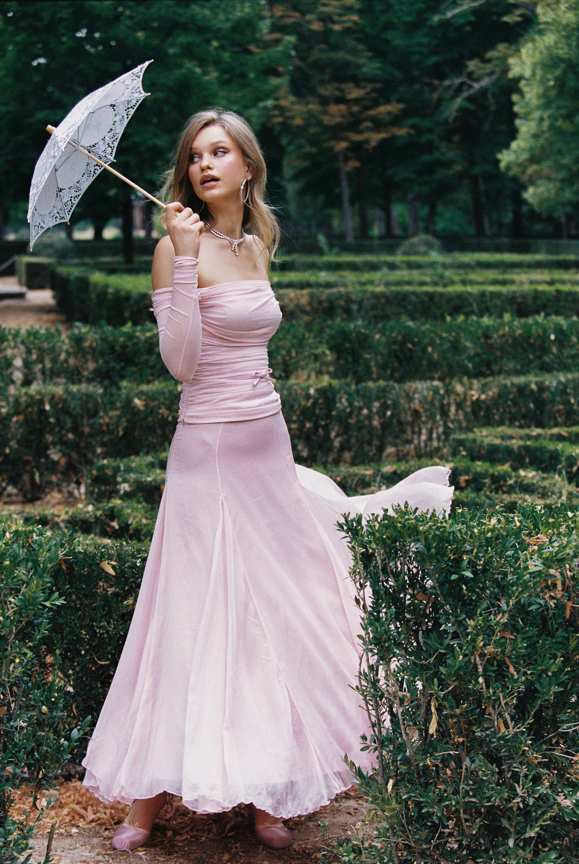 Neckline: Off-shoulder design frames the neckline and shoulders.