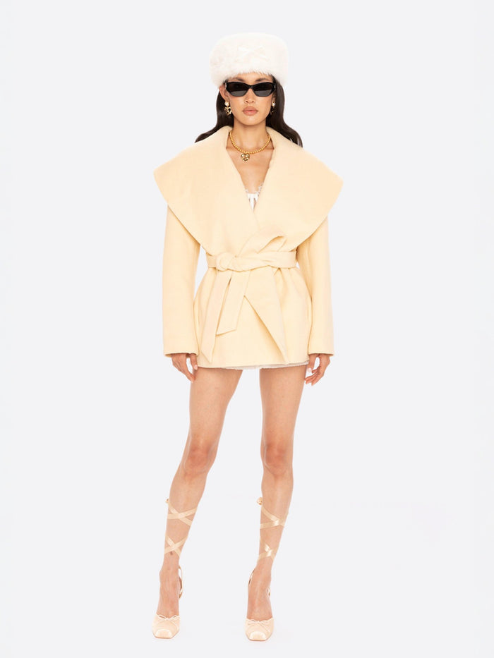 The Victoria Bow Coat is a vision of timeless romance, crafted from pure wool single-face fabric for warmth and softness. Its oversized lapel drapes like a graceful shawl, while the bow-tied belt cinches the waist for feminine elegance. A chic yellow wool coat that transitions seamlessly from day to evening, this elegant winter coat is the ultimate statement of refined outerwear. Features:Material: Pure wool fabric with plush softness and durability.Design: Oversized lapel coat silhouette creates feminine elegance.Fit: Relaxed body cinched with a bow belt for versatile styling.Detail: Back bow accent enhances this bow belt coat with playful charm.Colors: White, black, pink, and yellow for versatile options.Styling: This designer women’s coat elevates workwear, date looks, or everyday luxury.