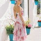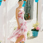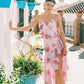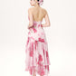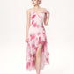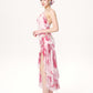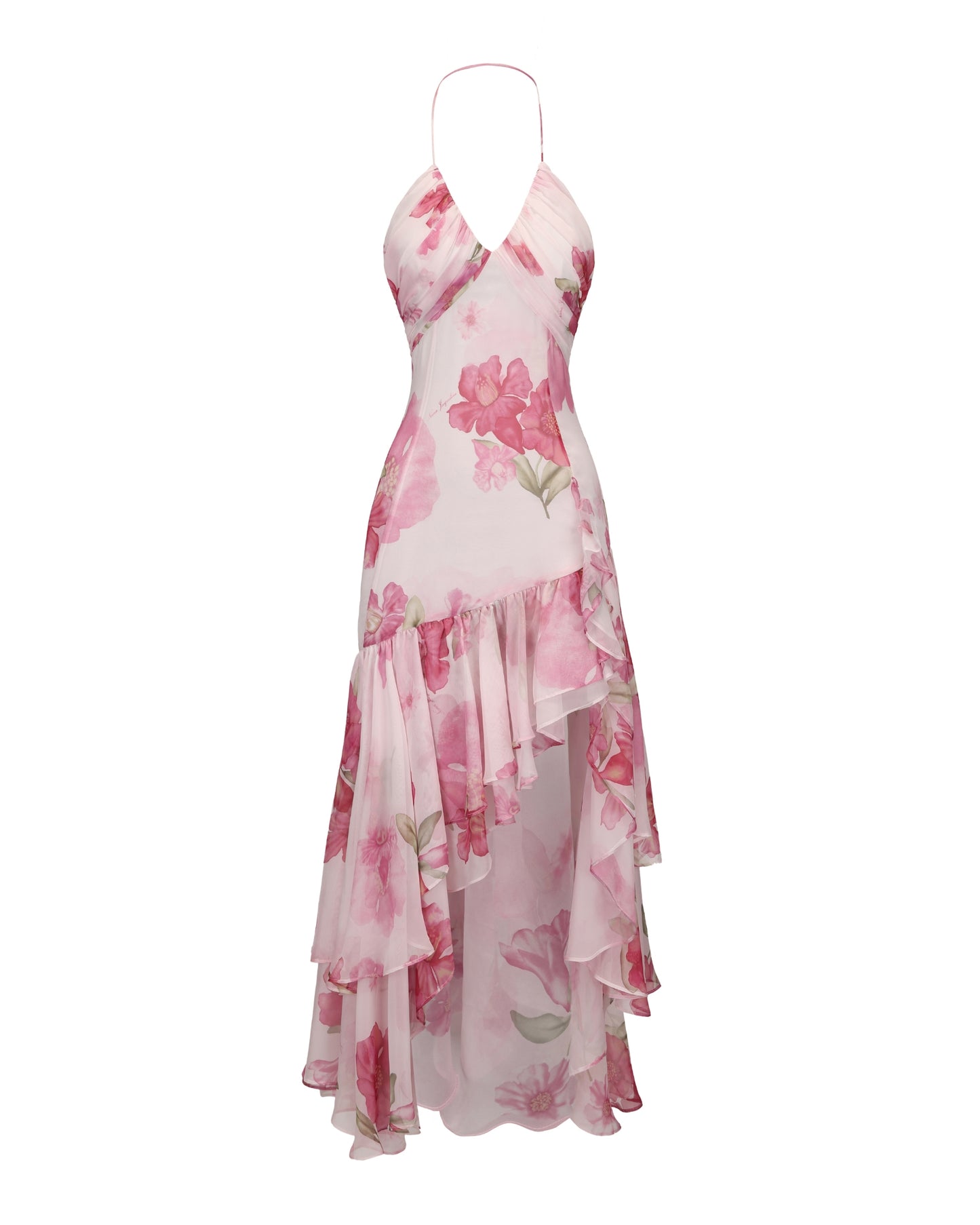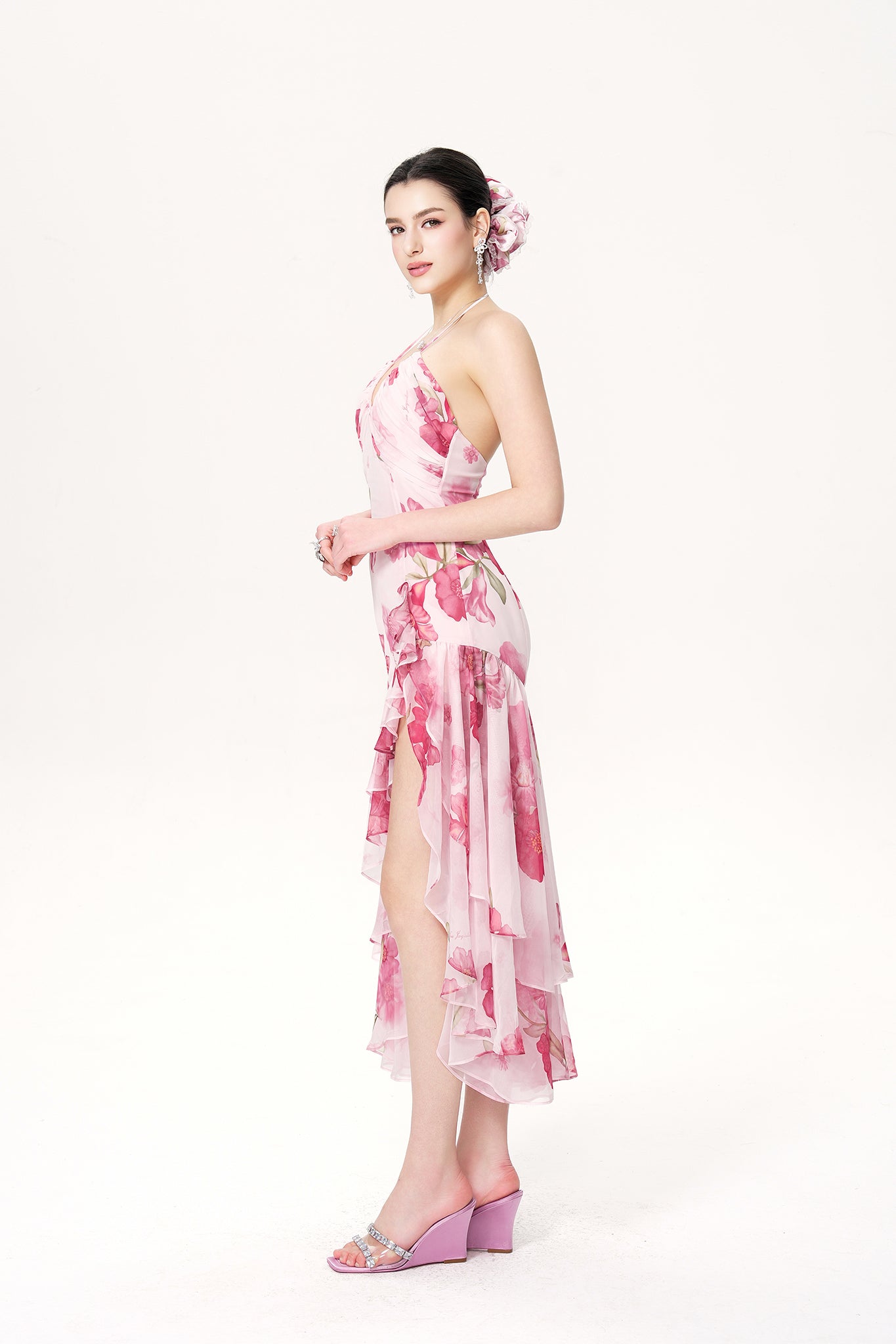 The Vivienne Dress flows with the grace of petals dancing in a gentle breeze. Made from soft chiffon with NJ’s exclusive floral print, this halter neck dress features an elegant irregular wave hem that moves lightly with every step. The pleated bodice sculpts and enhances the chest, while delicate ruffles on the skirt echo the layered pleats, creating a silhouette that is both refined and romantic.