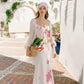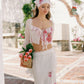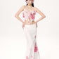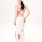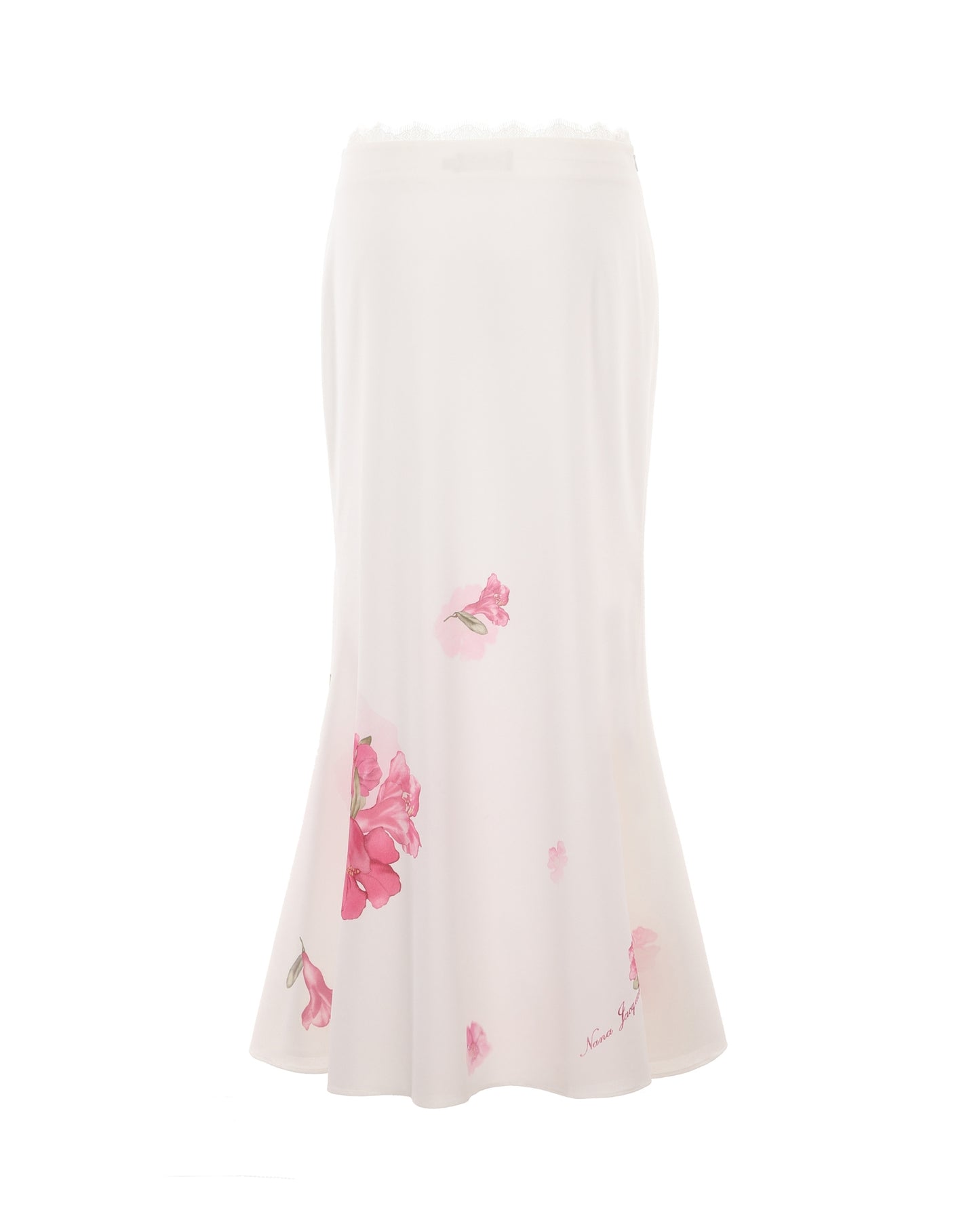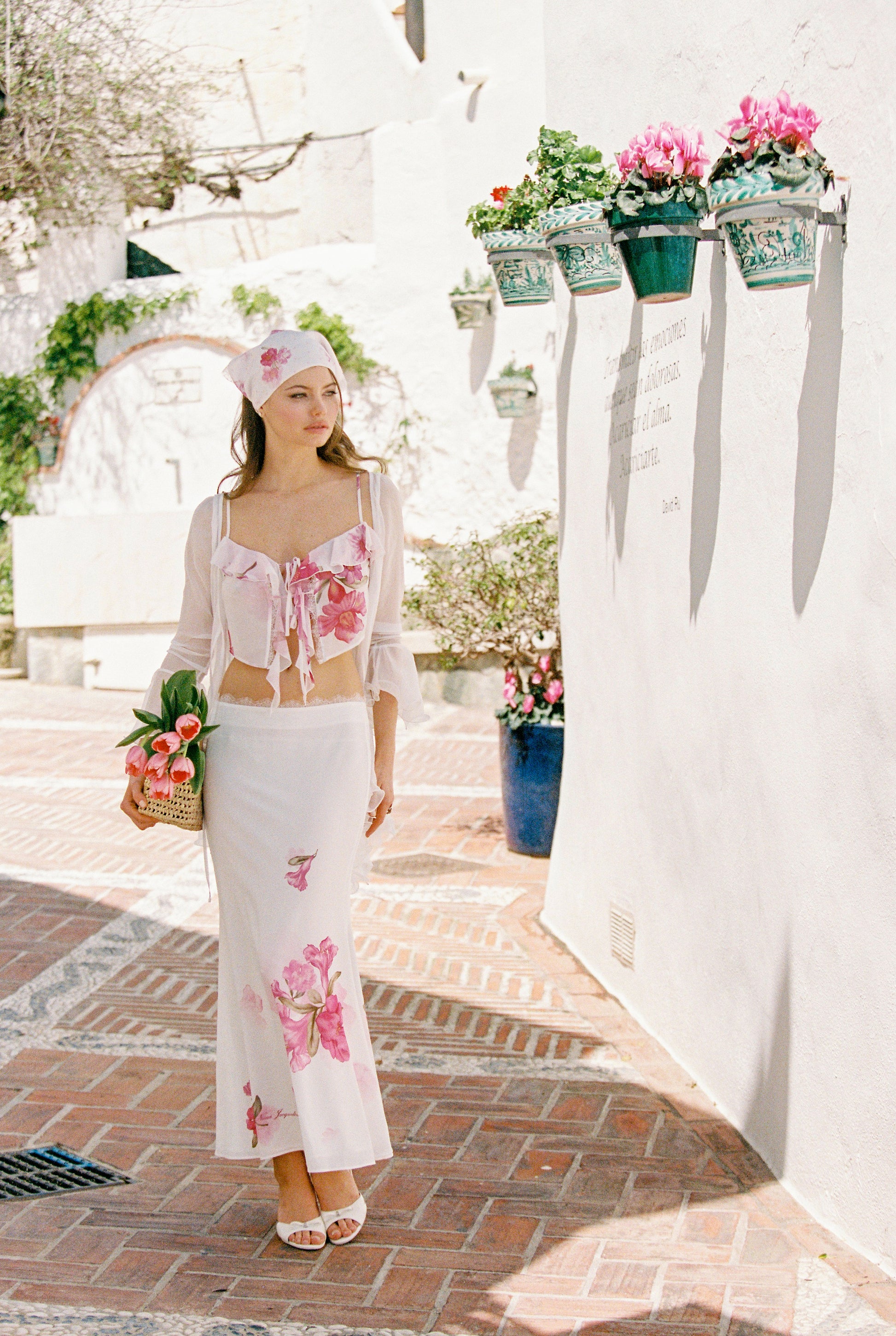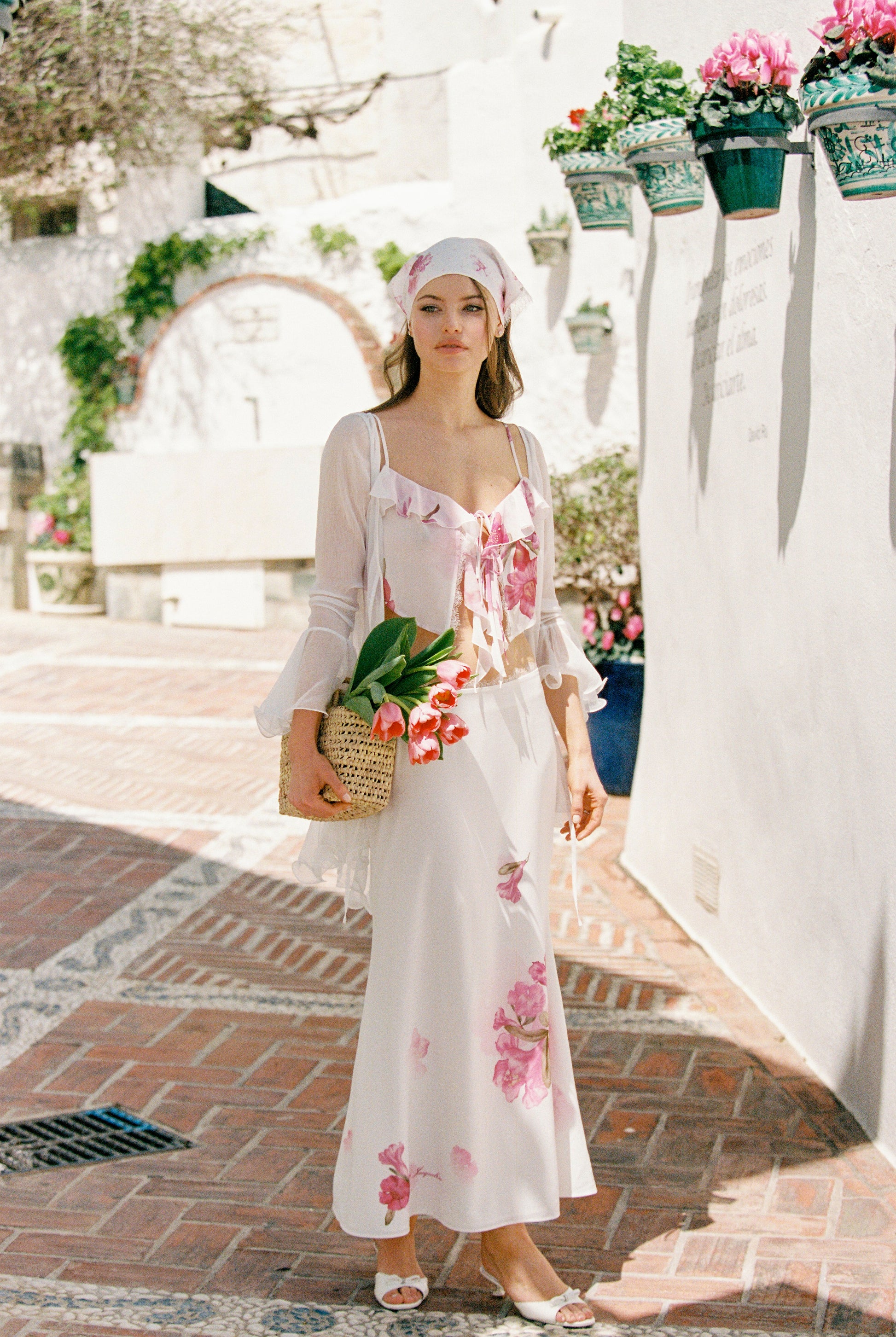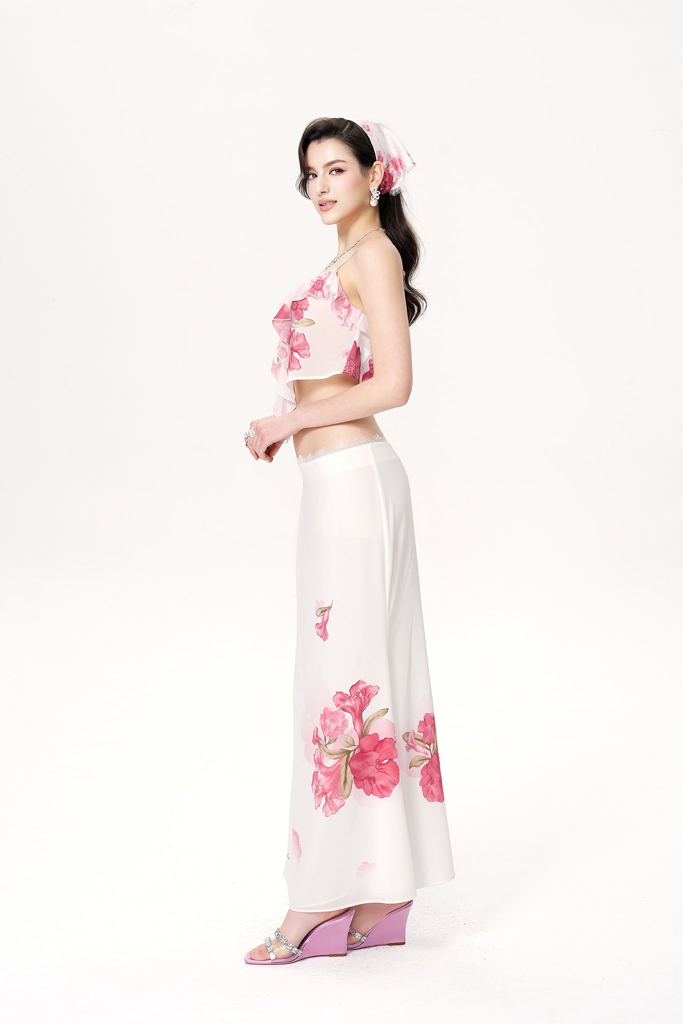 The Vivienne Skirt is a soft and romantic low waist maxi skirt that floats with effortless grace. Crafted from airy layers of tulle and chiffon, it features NJ’s original placement print, subtle florals that drift along the hem like petals in the breeze. A delicate touch of white lace at the waist adds a feeling of morning light and quiet elegance, while the fishtail hem brings a hint of romance to this summer floral printed skirt.