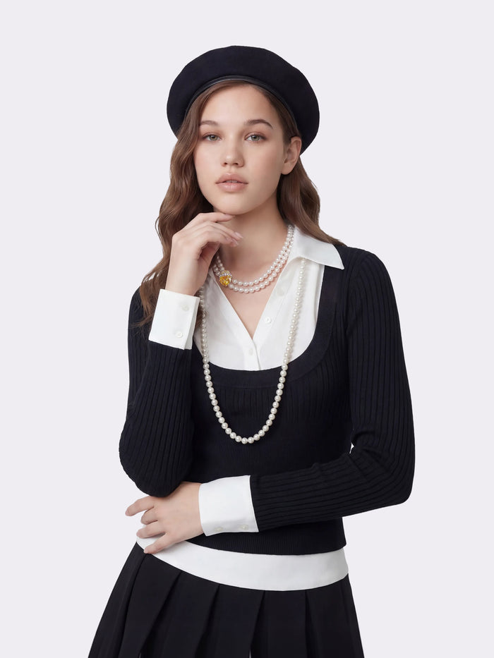 Claudette Contrast Collar Rib Knit Black Top