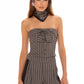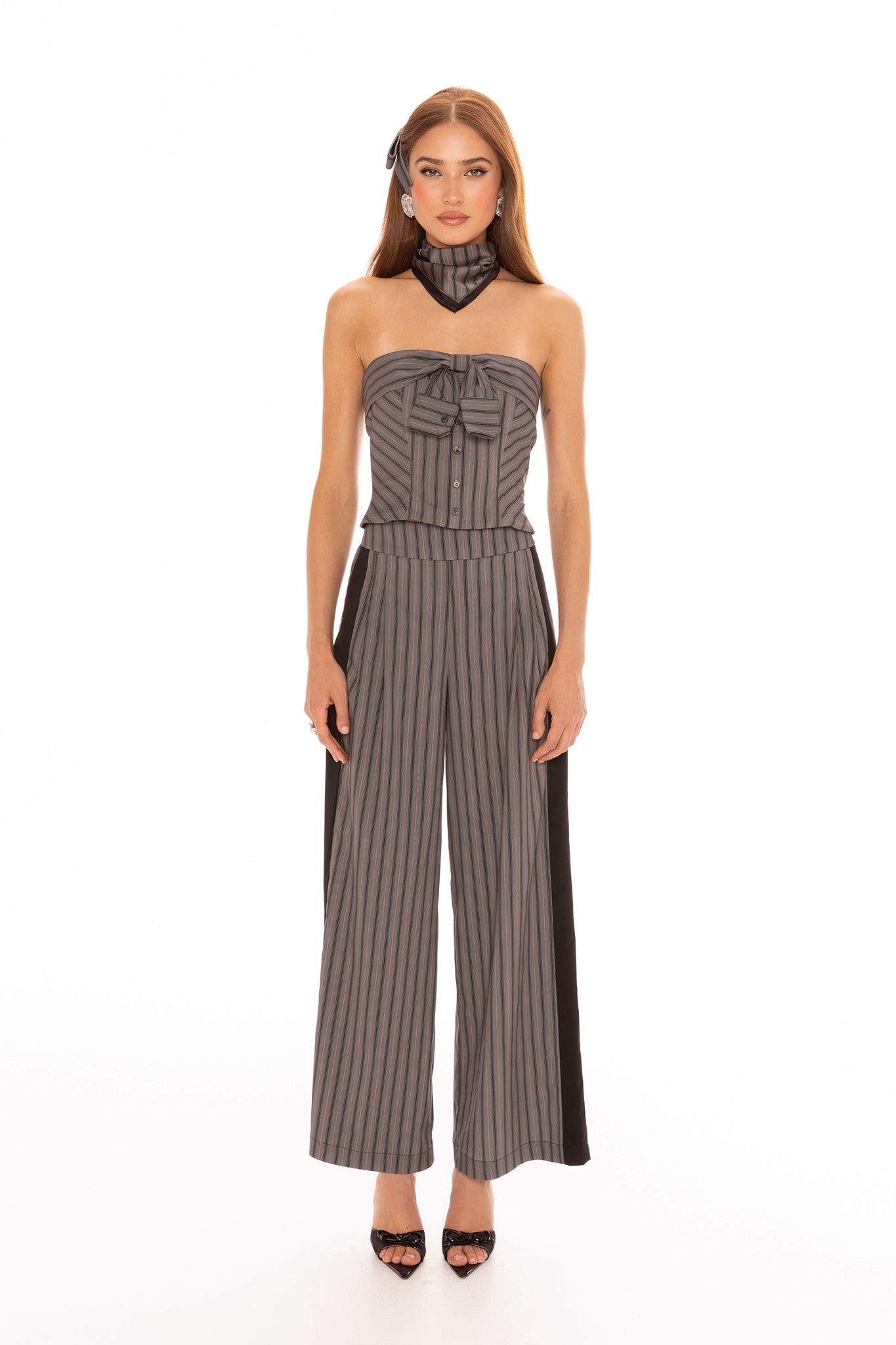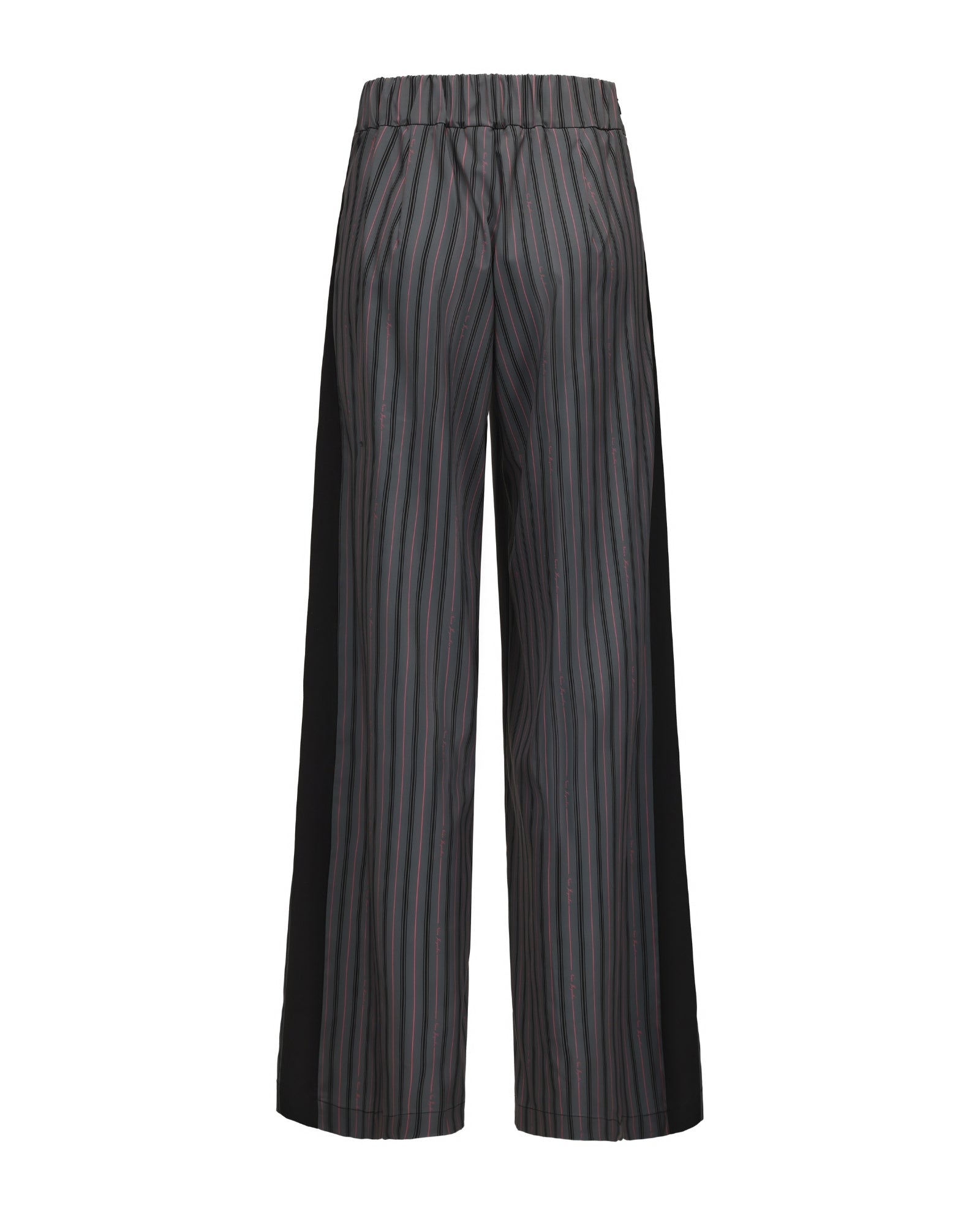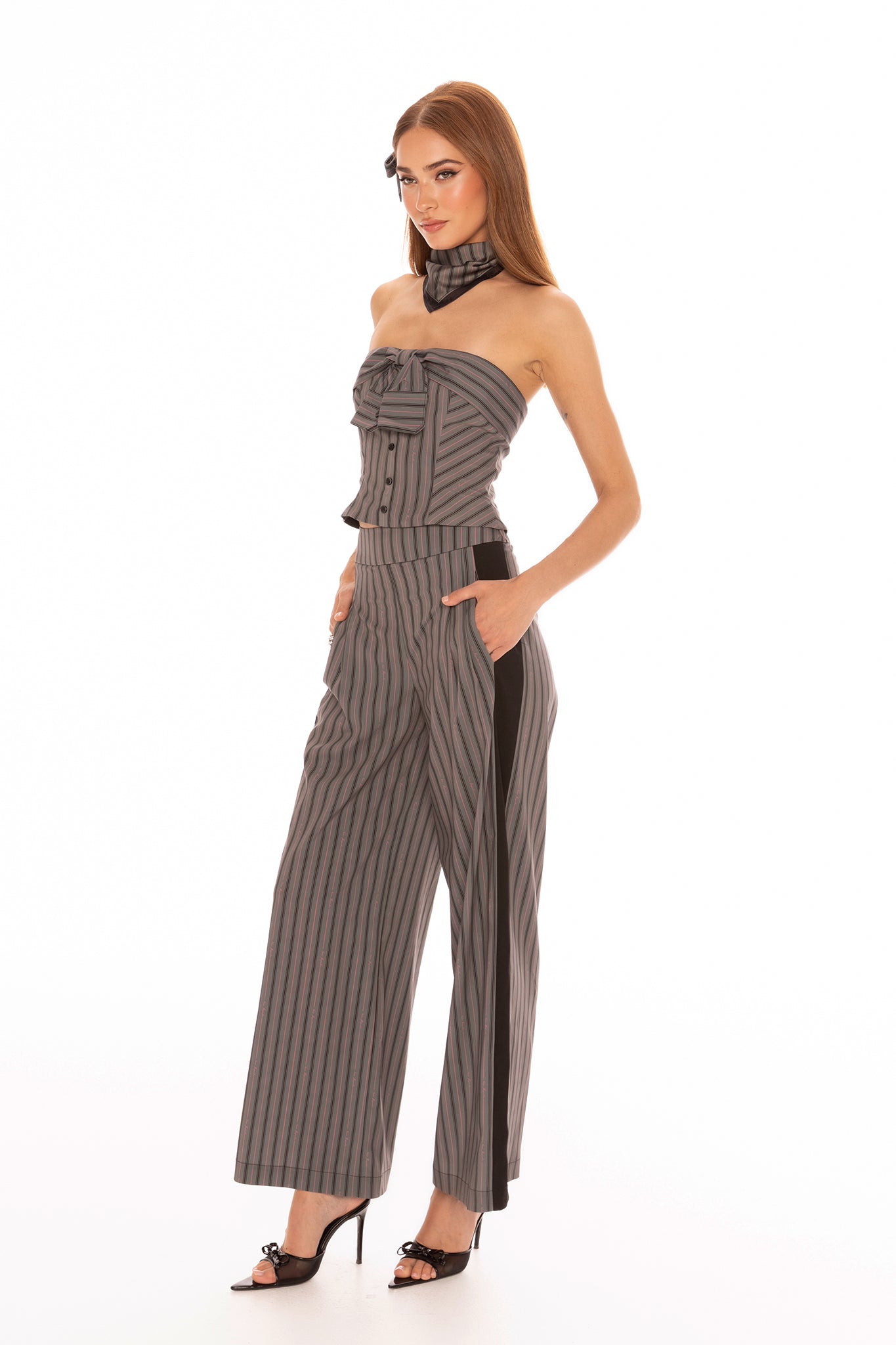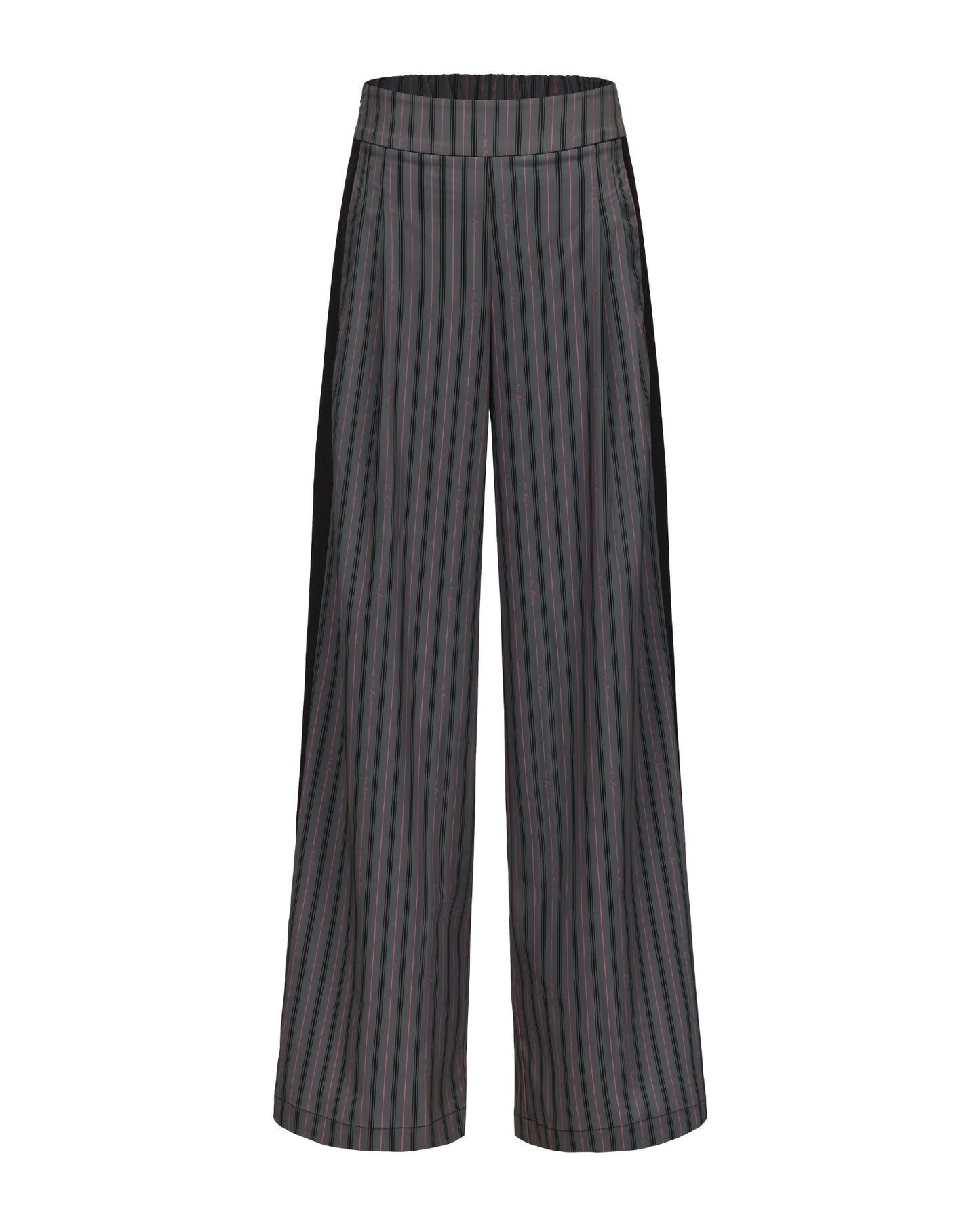 The Amber Pants blend sweetness and sophistication, crafted from lightweight suiting fabric with a dark gray base and black and thin pink stripes for a refreshing, feminine feel. The tailored straight-leg silhouette elongates the legs and flatters the figure, while playful stripe placement adds visual interest and charm to every step.