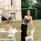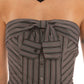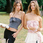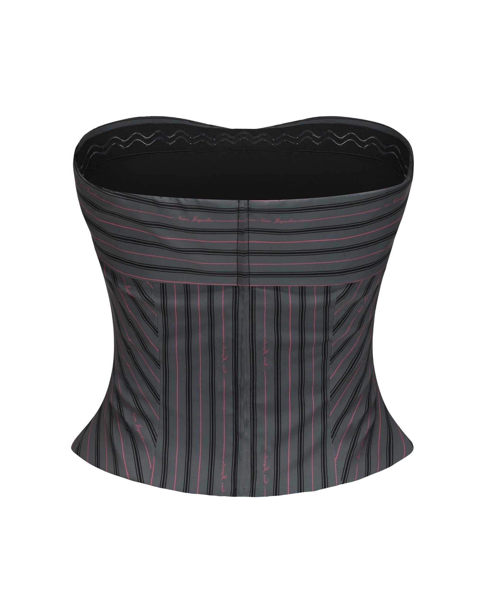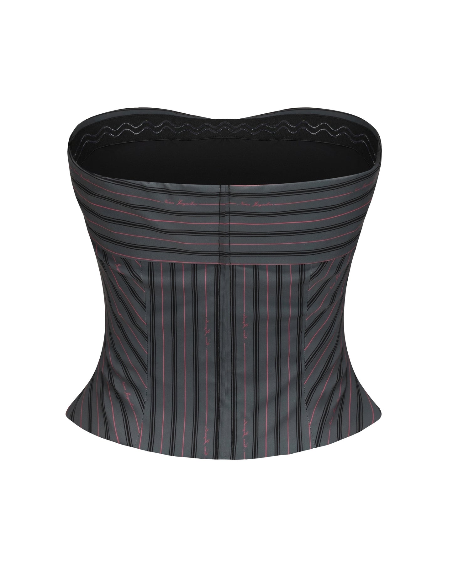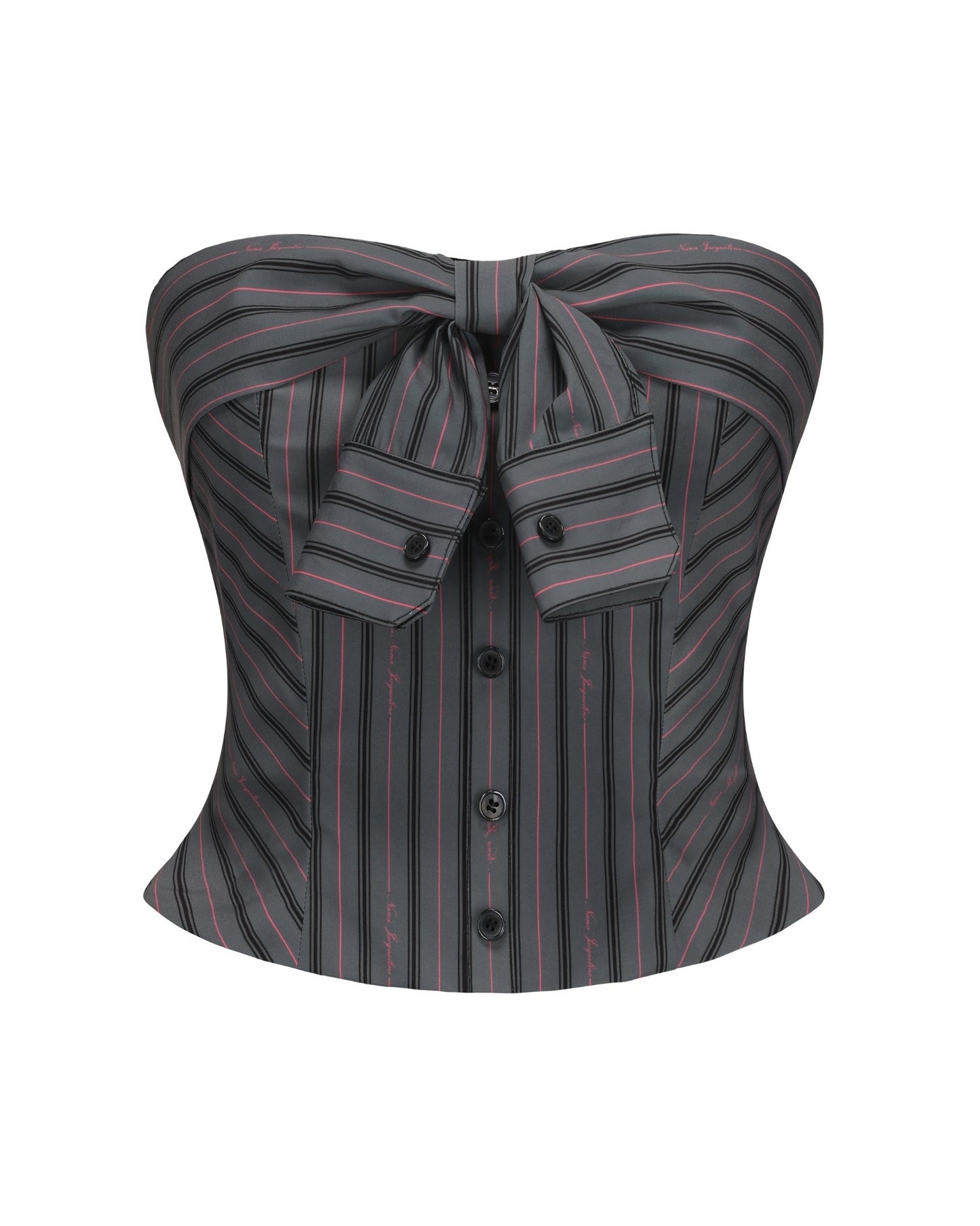 The Amber Top brings playful charm to a polished silhouette. Designed with a bold front bow made from shirt cuffs, this striped strapless top features a flattering corset-style waist and a sculpted neckline. The soft pink thin pinstripe pattern adds a touch of romance. Comes with a matching scarf for a complete coquette-inspired look.