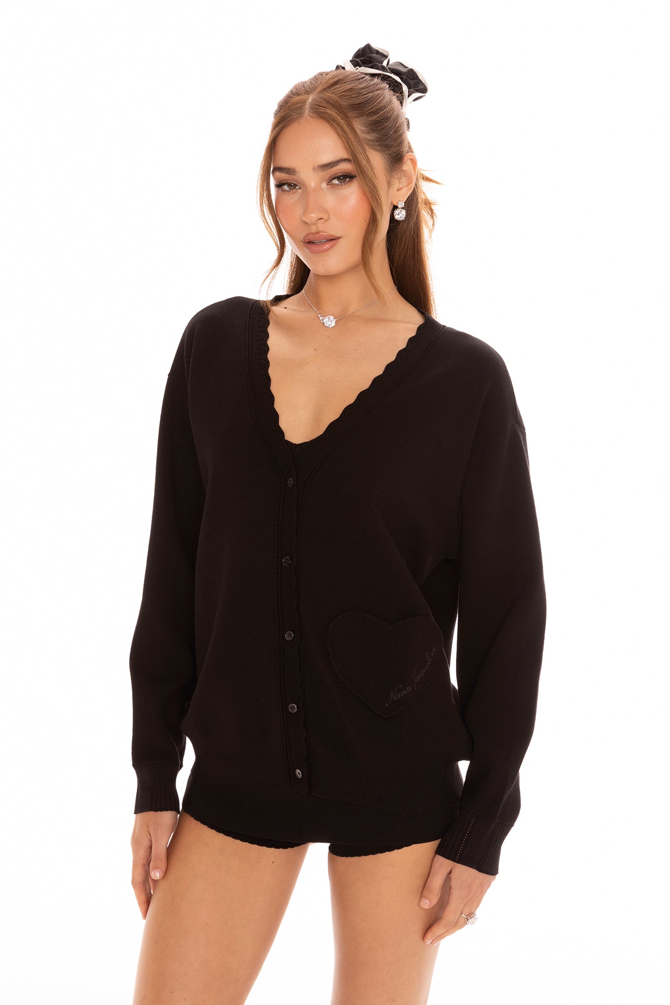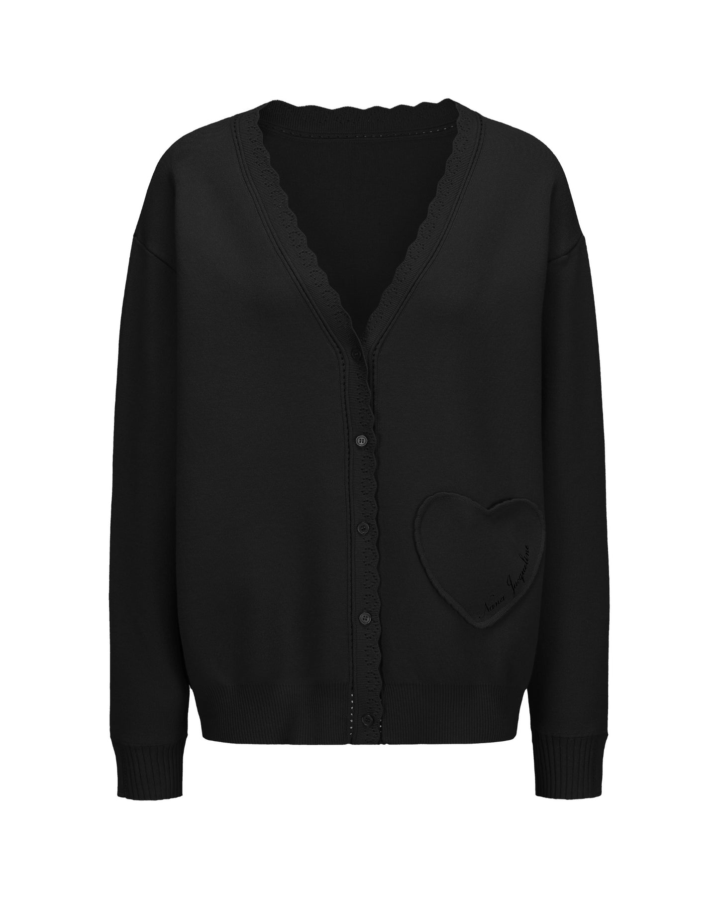 The Carrie Cardigan is a sweet and feminine cardigan made from soft, skin-friendly yarn with a relaxed silhouette. Heart-shaped lace details and tonal buttons bring romantic charm, while a heart-shaped patch pocket with embroidery adds playful elegance. This soft knit cardigan for women is perfect for both lounging at home and stepping out with grace.