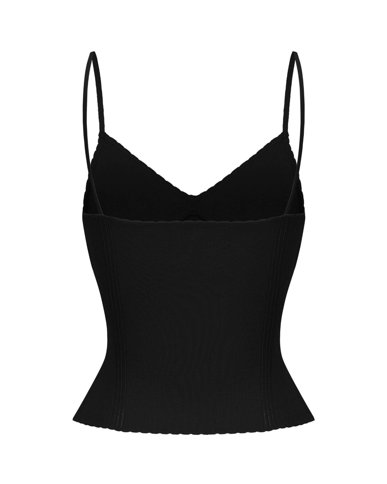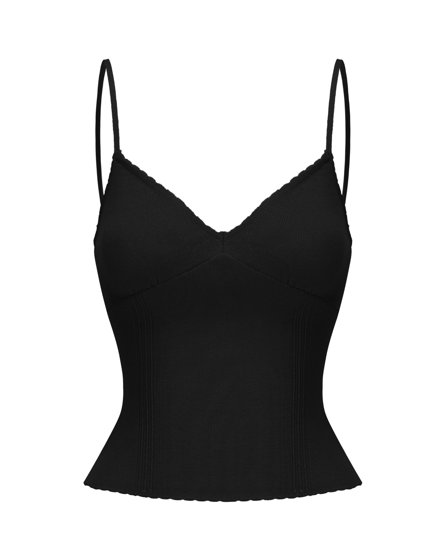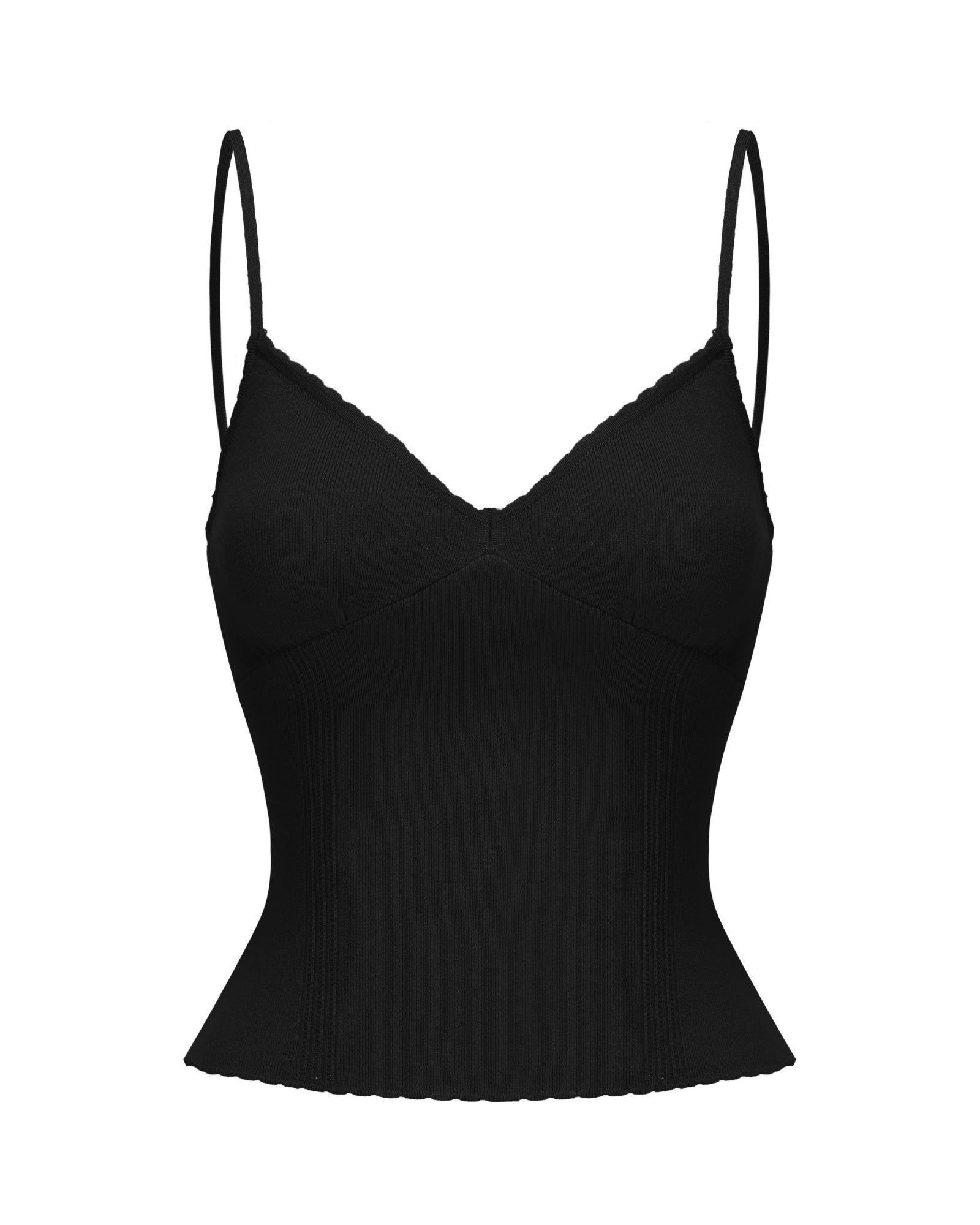 The Carrie Top is a romantic feminine top designed to flatter and charm. Crafted from soft, high-twist core-spun yarn, this elegant knitted tank top features delicate lace trim and a cinched waist that highlights your natural shape. The flattering V-neckline camisole frames the collarbone and creates a graceful, sculpted silhouette.