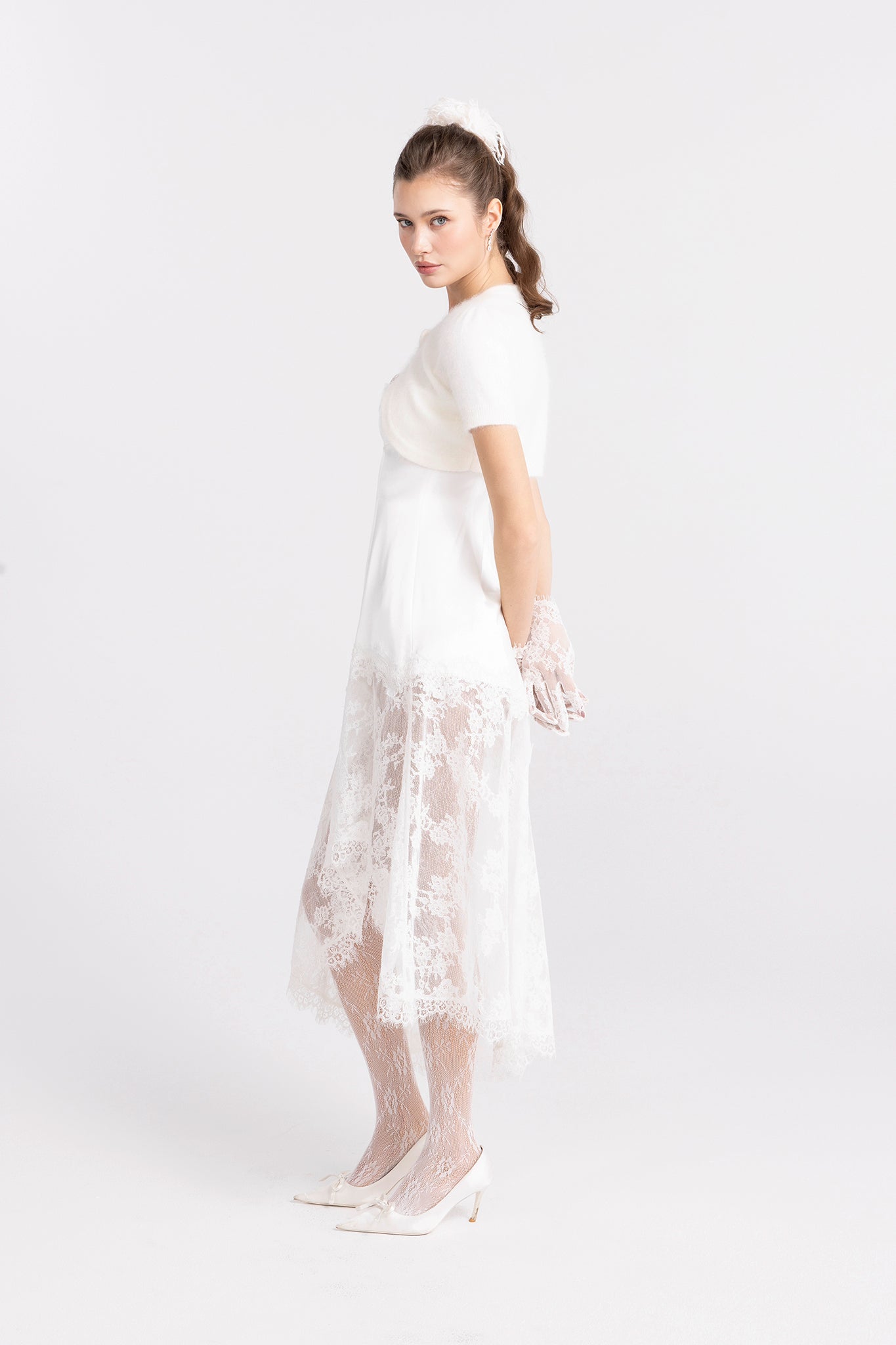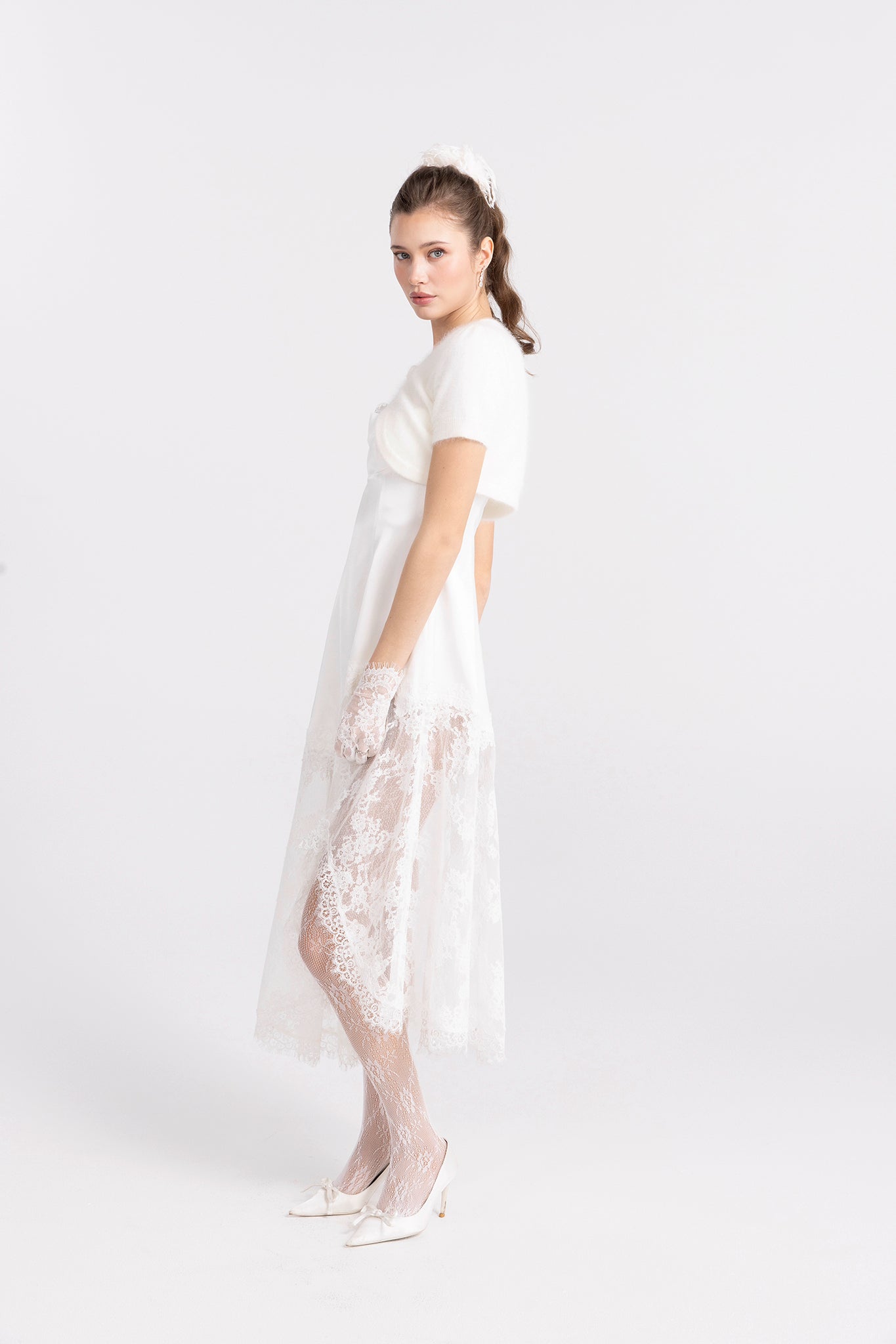 The Elara Knitted Cropped Cardigan is a soft nod to retro romance, where plush fleece yarn meets a cropped, French-inspired silhouette. Designed as a delicate cloud-like shawl, this white cardigan drapes effortlessly over dresses, blending sweetness, warmth, and refined vintage charm.
