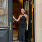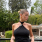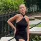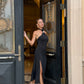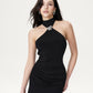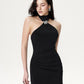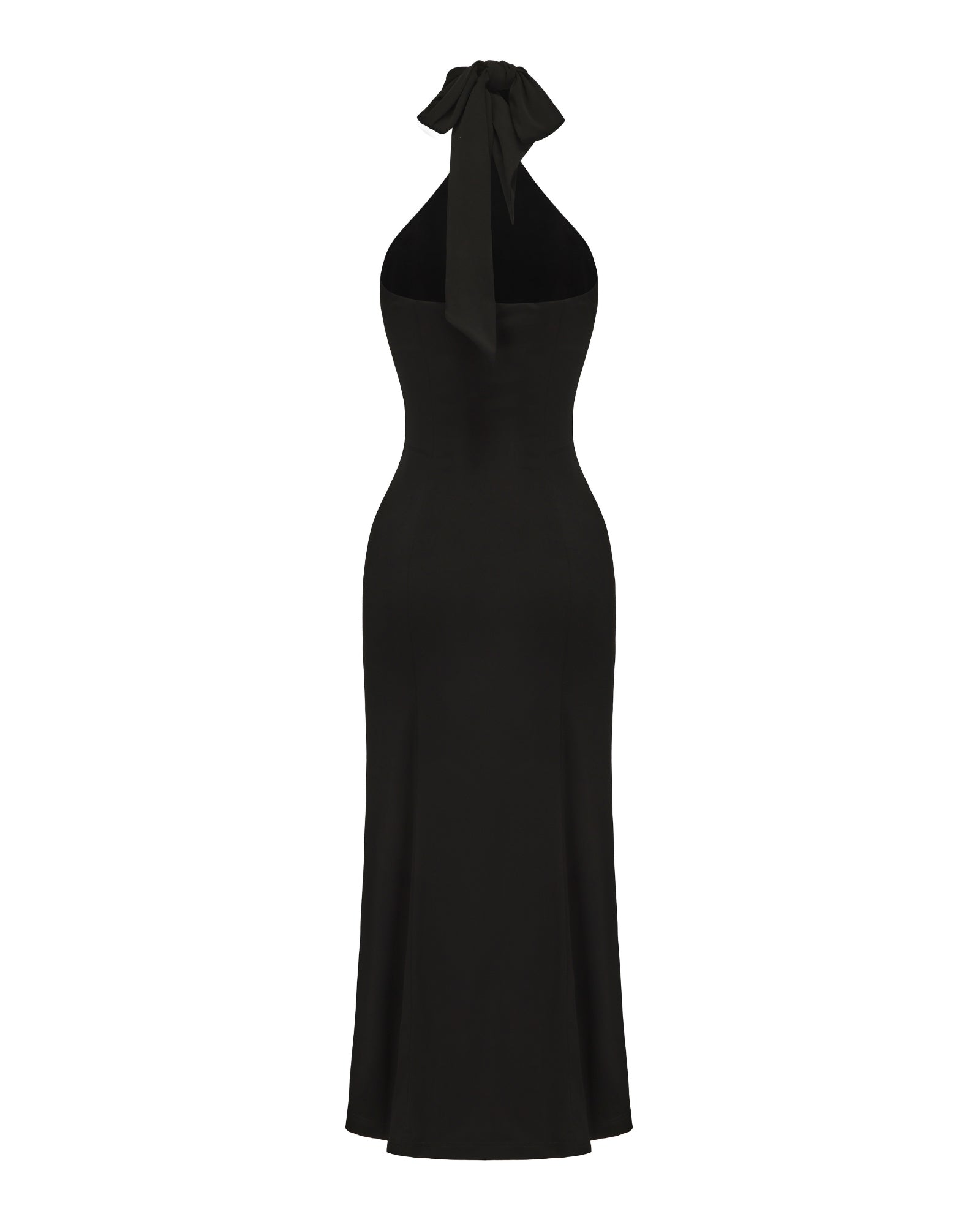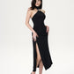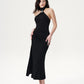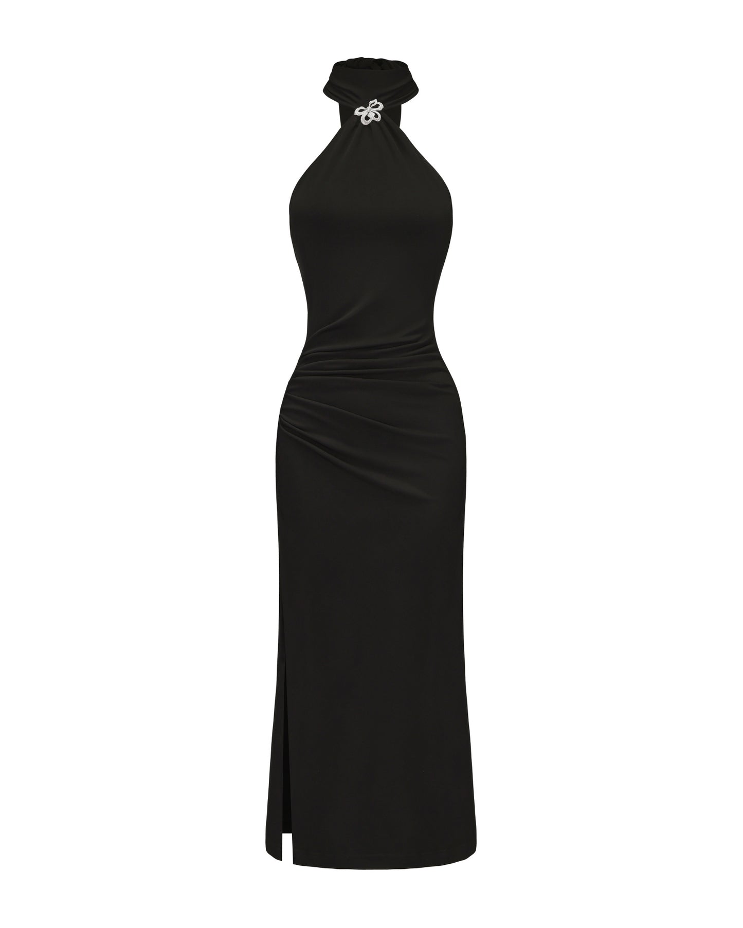 The Eliana Dress seamlessly blends elegance and allure, designed to accentuate your curves with every movement. The smooth, stretch-fabric contours the body, highlighting your silhouette. The halter neck lace-up design, adorned with diamond-embellished flower brooches, draws attention to the delicate beauty of your neck and shoulders. A splayed shirring detail on one side gently shapes the waist, while the high slits reveal the graceful curve of your legs, offering a touch of charm and sophistication.