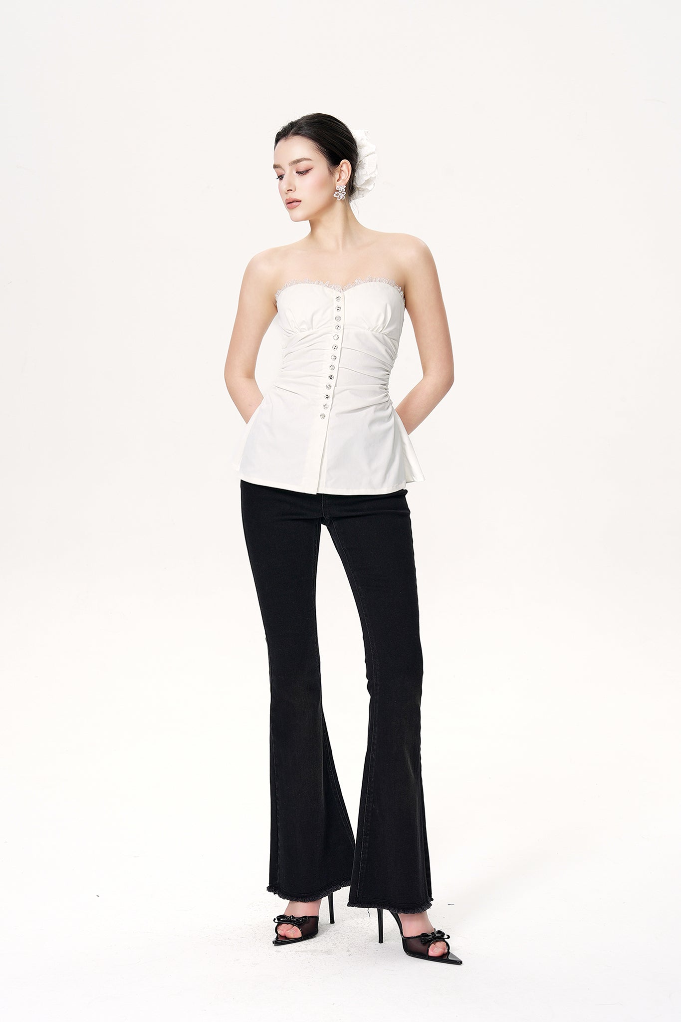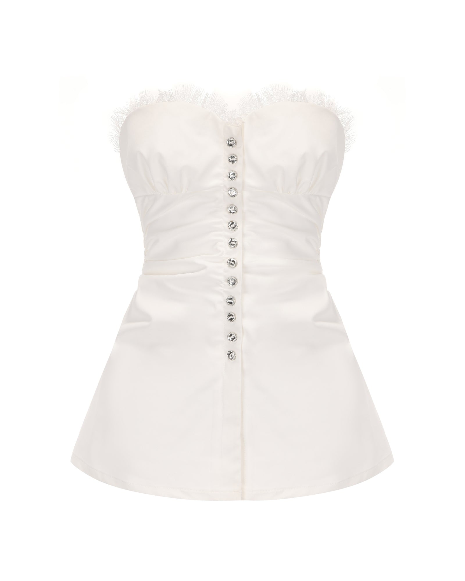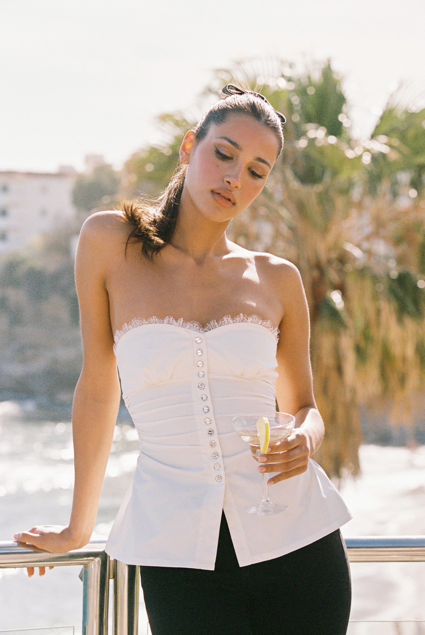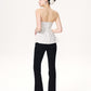 The Margaux Top exudes purity and elegance with its white micro-elastic twill fabric, subtly shimmering with luster. Shaped like a pomegranate flower, the delicate folds at the hem enhance the bust, while the waist is cinched with subtle shirring and divergent pleats, creating soft curves. Sparkling crystal buckles adds a touch of sophistication, and the flying hemline offers a playful, flattering movement.