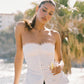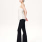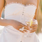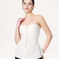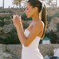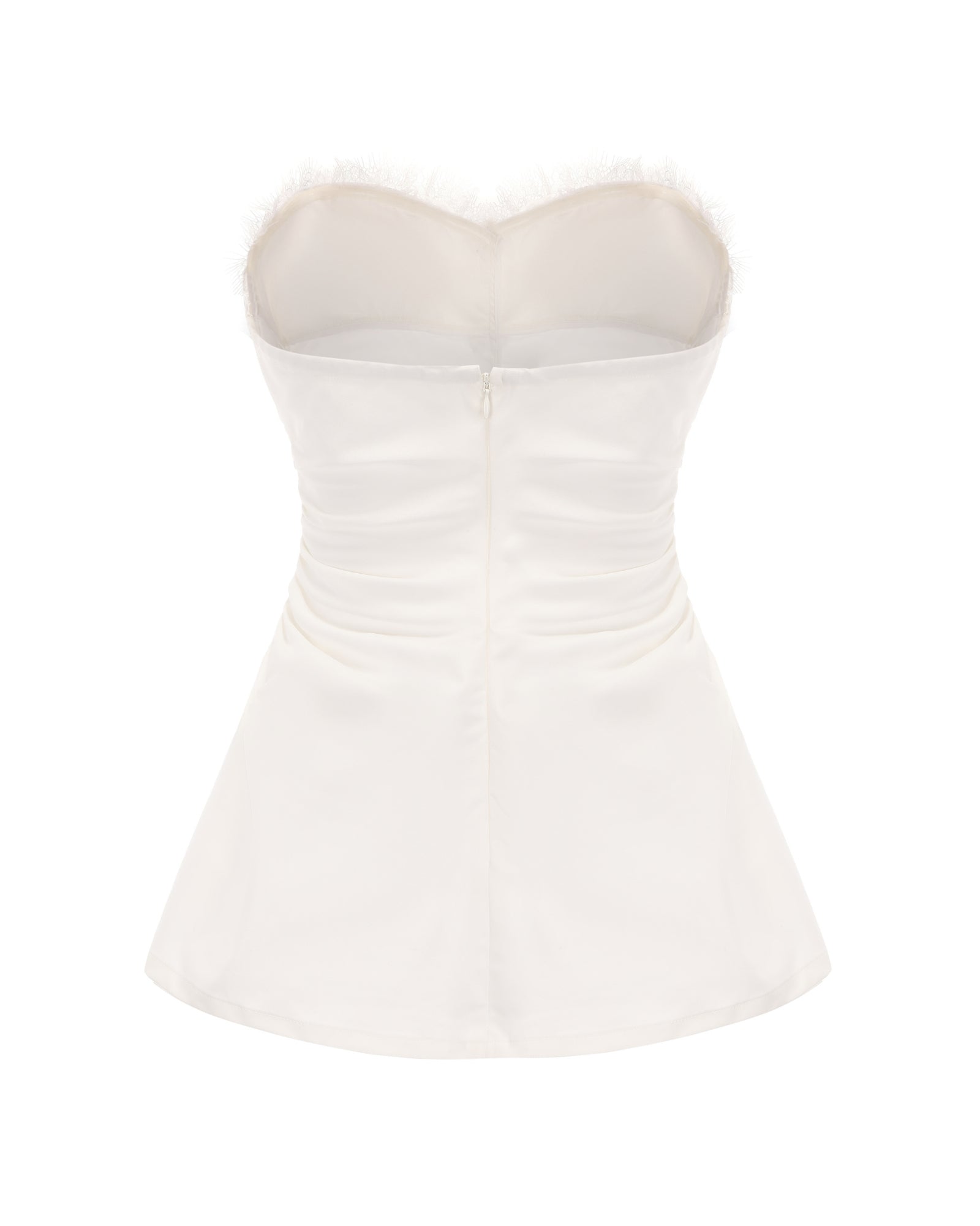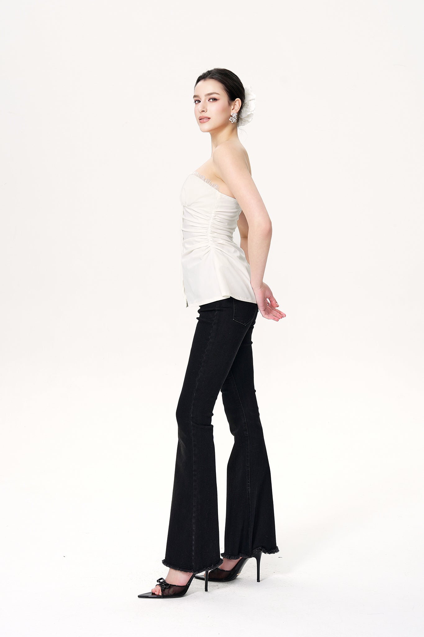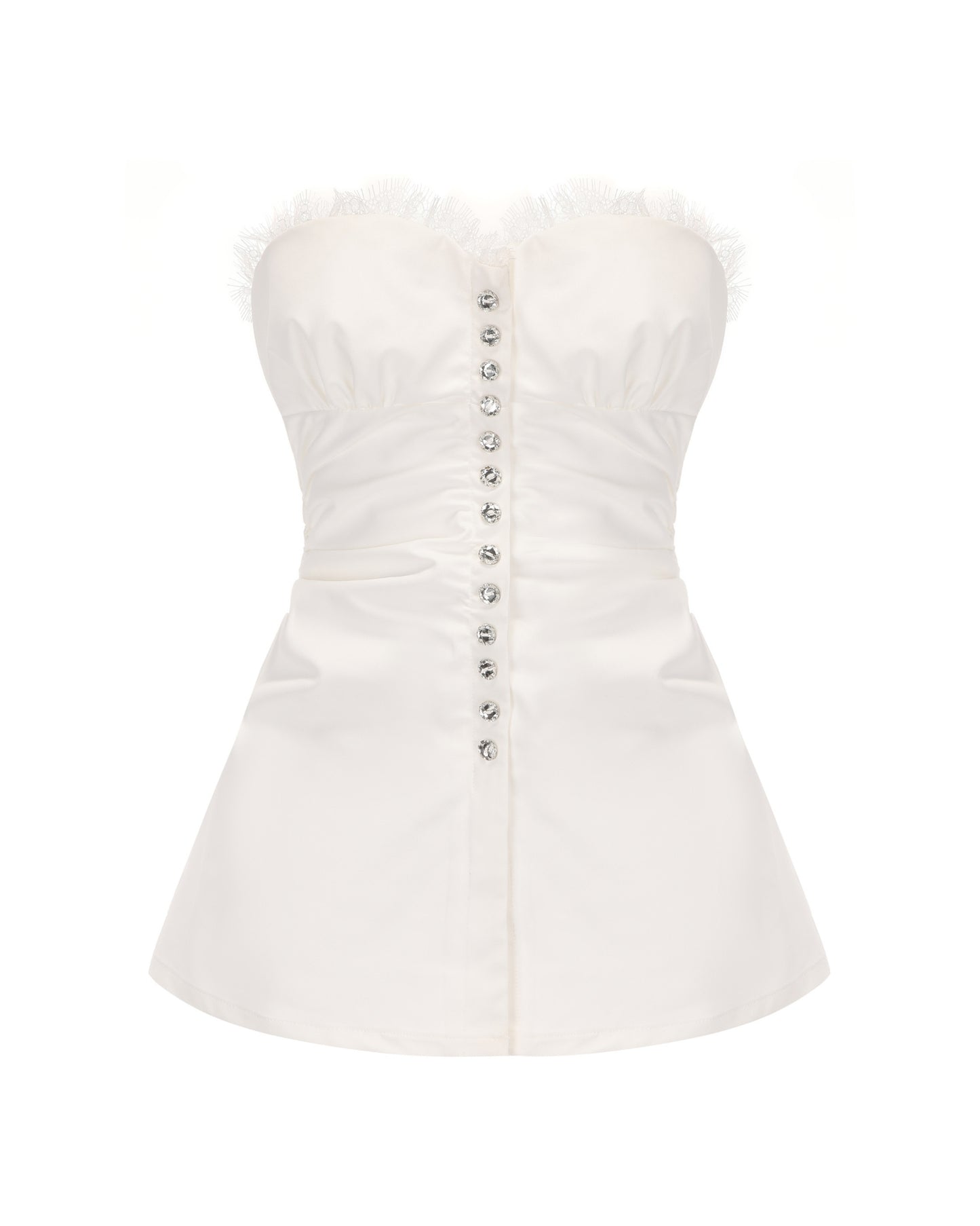 The Margaux Top exudes purity and elegance with its white micro-elastic twill fabric, subtly shimmering with luster. Shaped like a pomegranate flower, the delicate folds at the hem enhance the bust, while the waist is cinched with subtle shirring and divergent pleats, creating soft curves. Sparkling crystal buckles adds a touch of sophistication, and the flying hemline offers a playful, flattering movement.