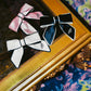 Make every hairstyle feel special with the Marlene Bow in white satin, finished with sleek black edges and elegant “NG” embroidery. Designed with a secure alligator clip, it’s perfect for everyday wear or dressing up for events. This timeless accessory adds a touch of charm and sophistication to your look.