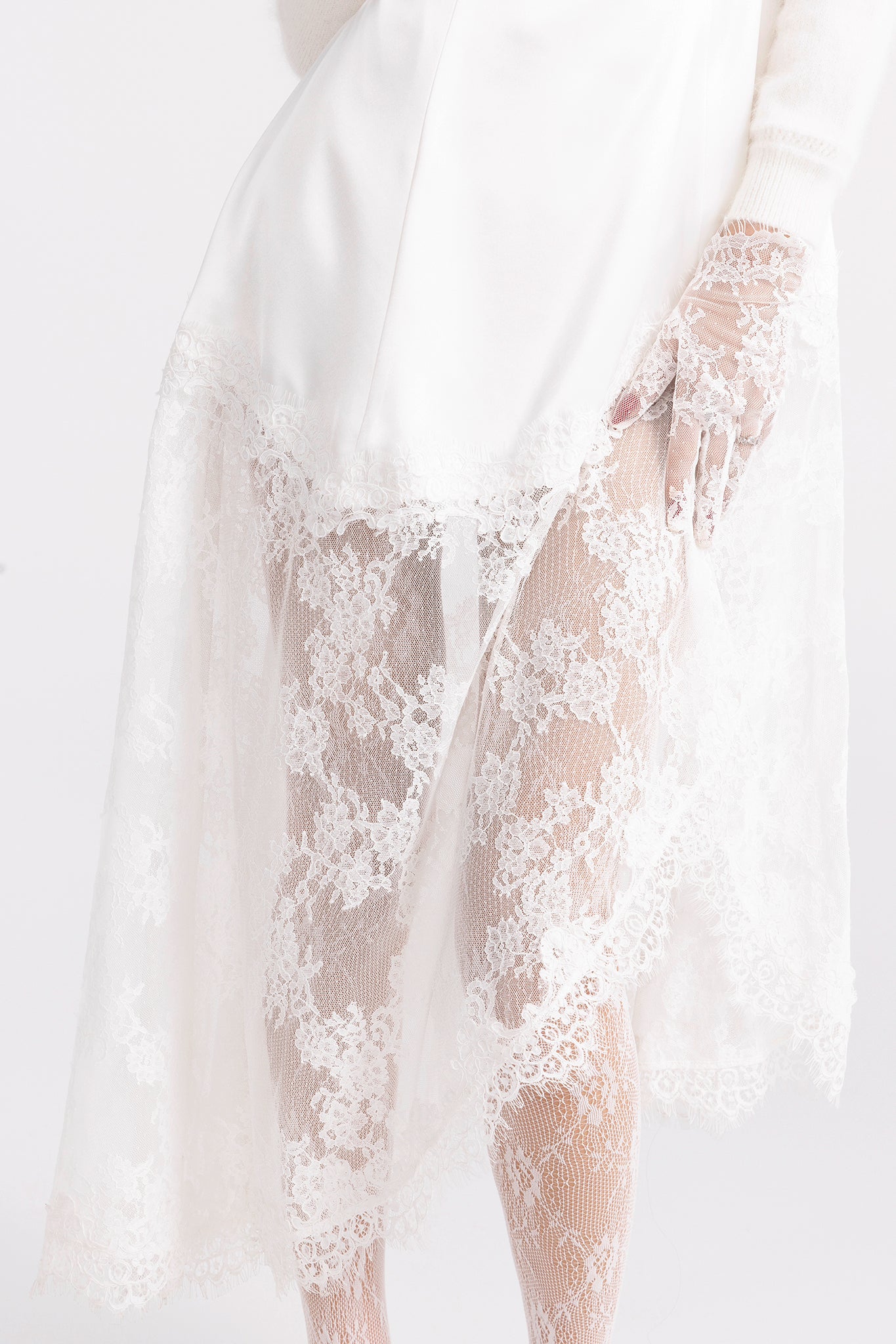 • Material: Acetate white satin with intricate lace trim.