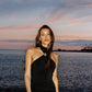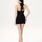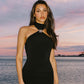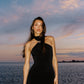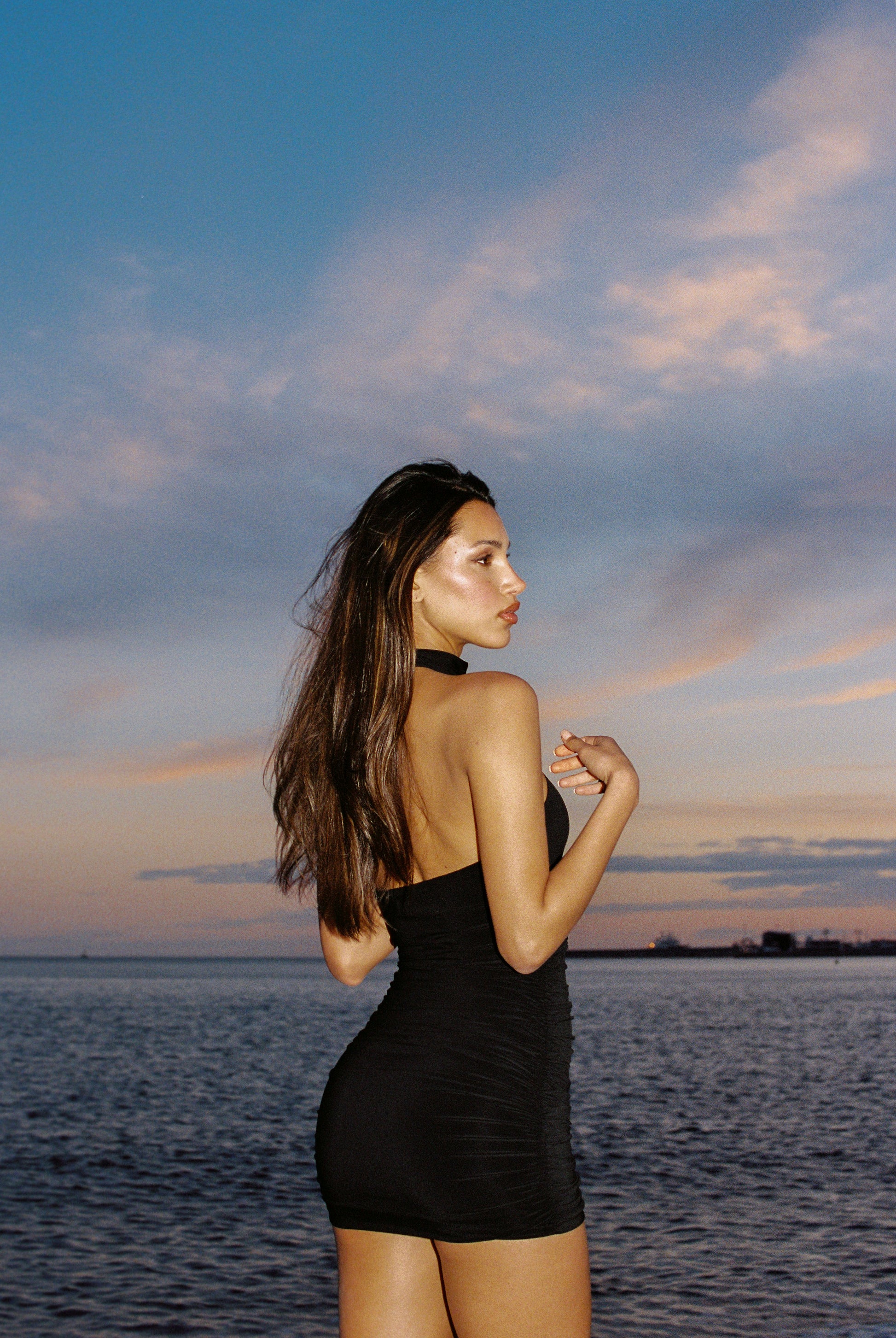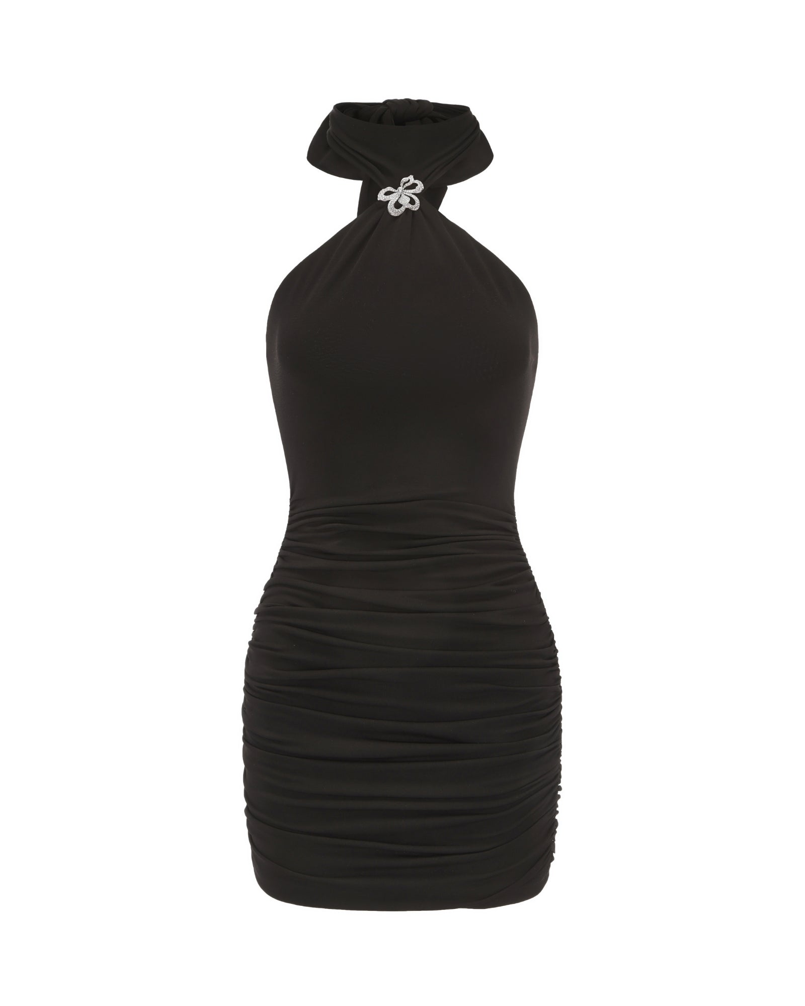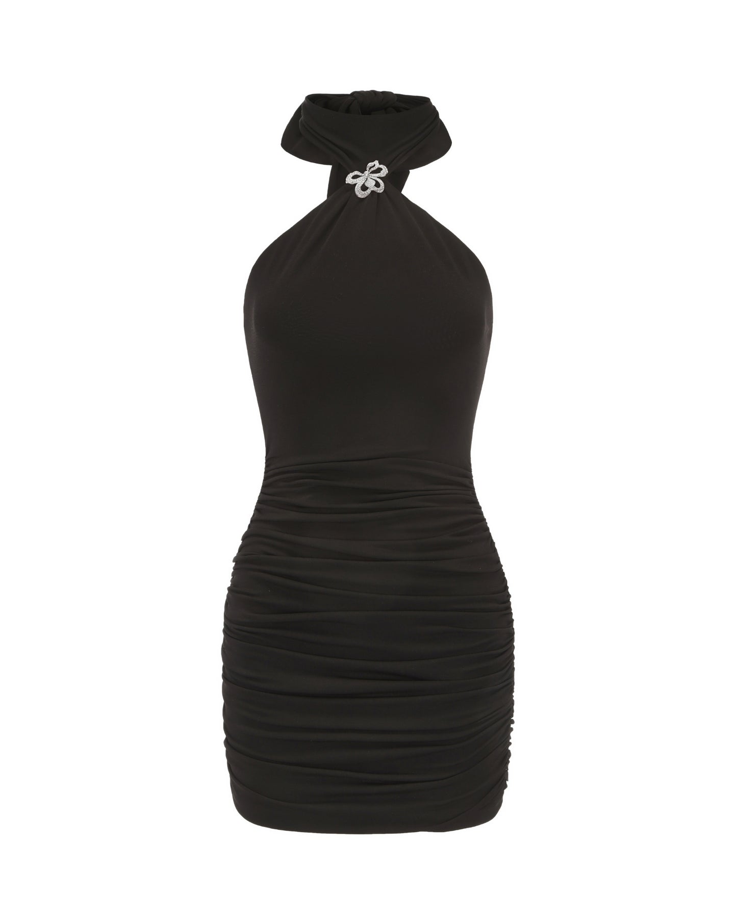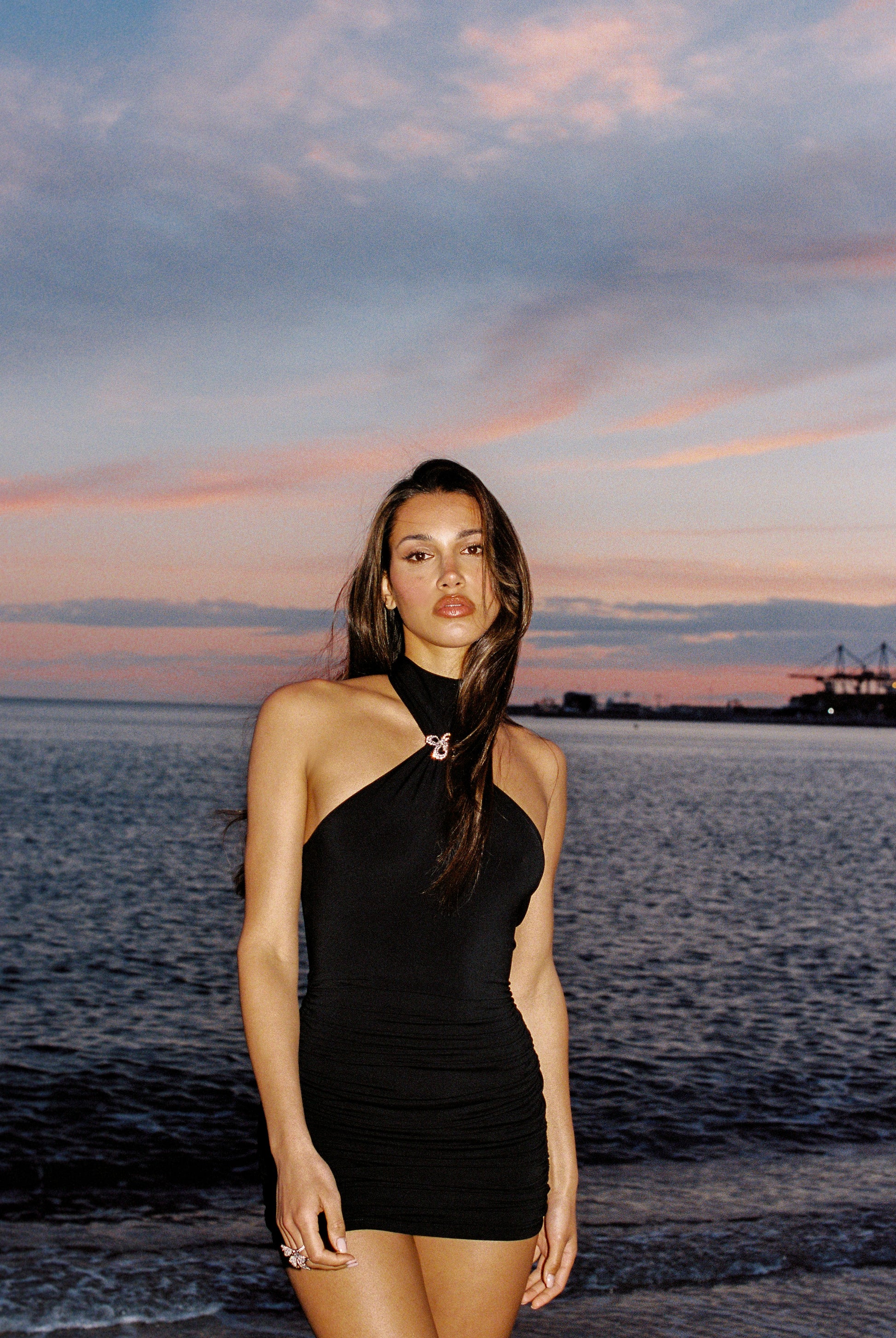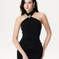 The Nova Dress captures the perfect harmony of grace and confidence. Crafted from silky stretch-knit fabric, it gently hugs the body, tracing soft, feminine curves. A halterneck lace-up is adorned with a detachable diamond-embellished flower brooch, shimmering like morning dew. Shirring along the skirt softens the silhouette, adding fluid elegance. Designed to celebrate natural beauty with refined charm.