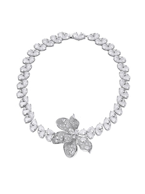 The Portia Necklace gracefully drapes along the collarbone, with delicate detailing that evokes the gentle glow of a secret garden’s midnight blossoms.