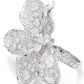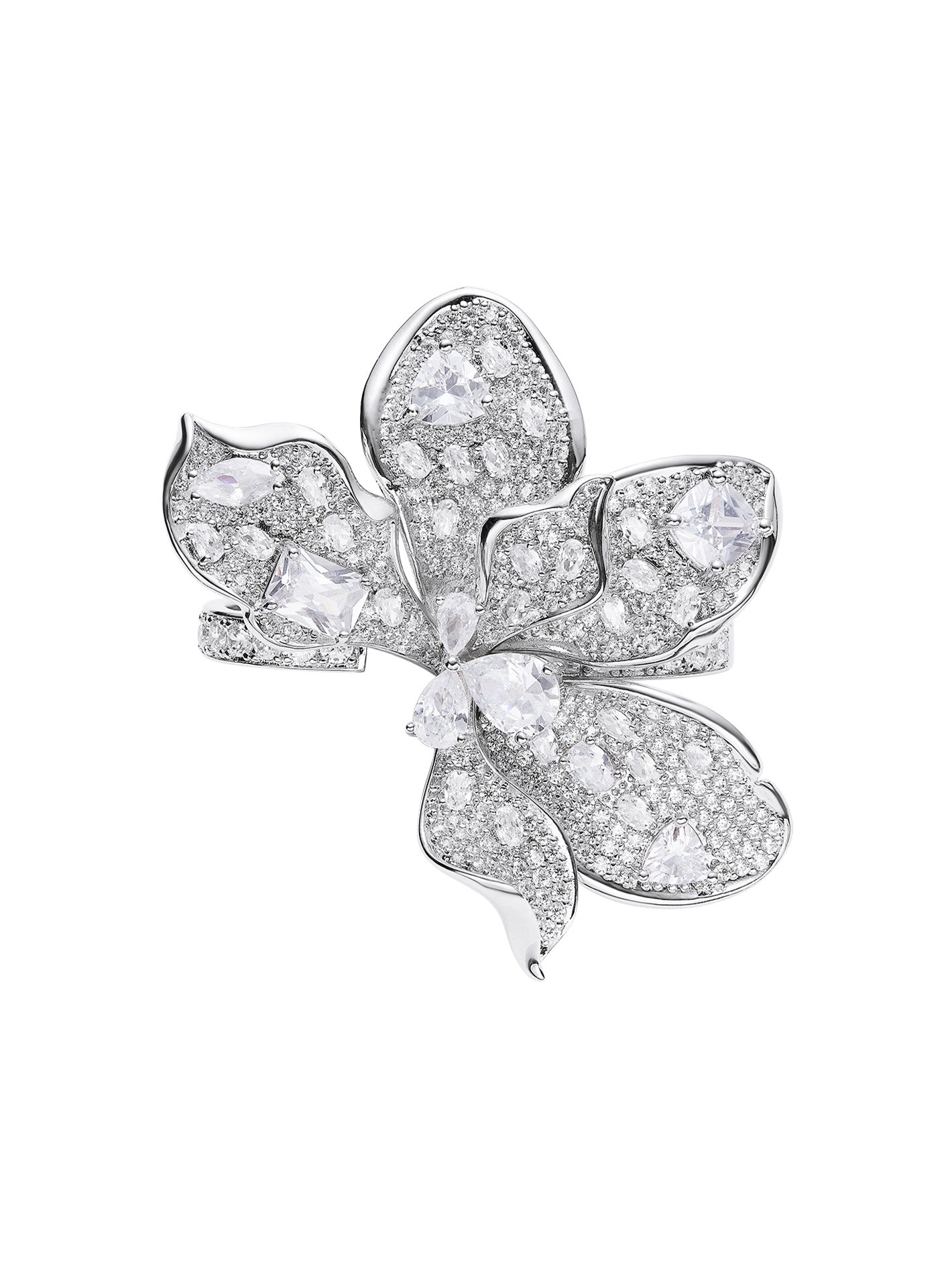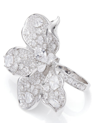 The Portia Ring features a bold silver triangular bloom made from shimmering vermiculite and crystals, capturing the quiet majesty of a flower unfolding in the moonlight.