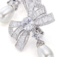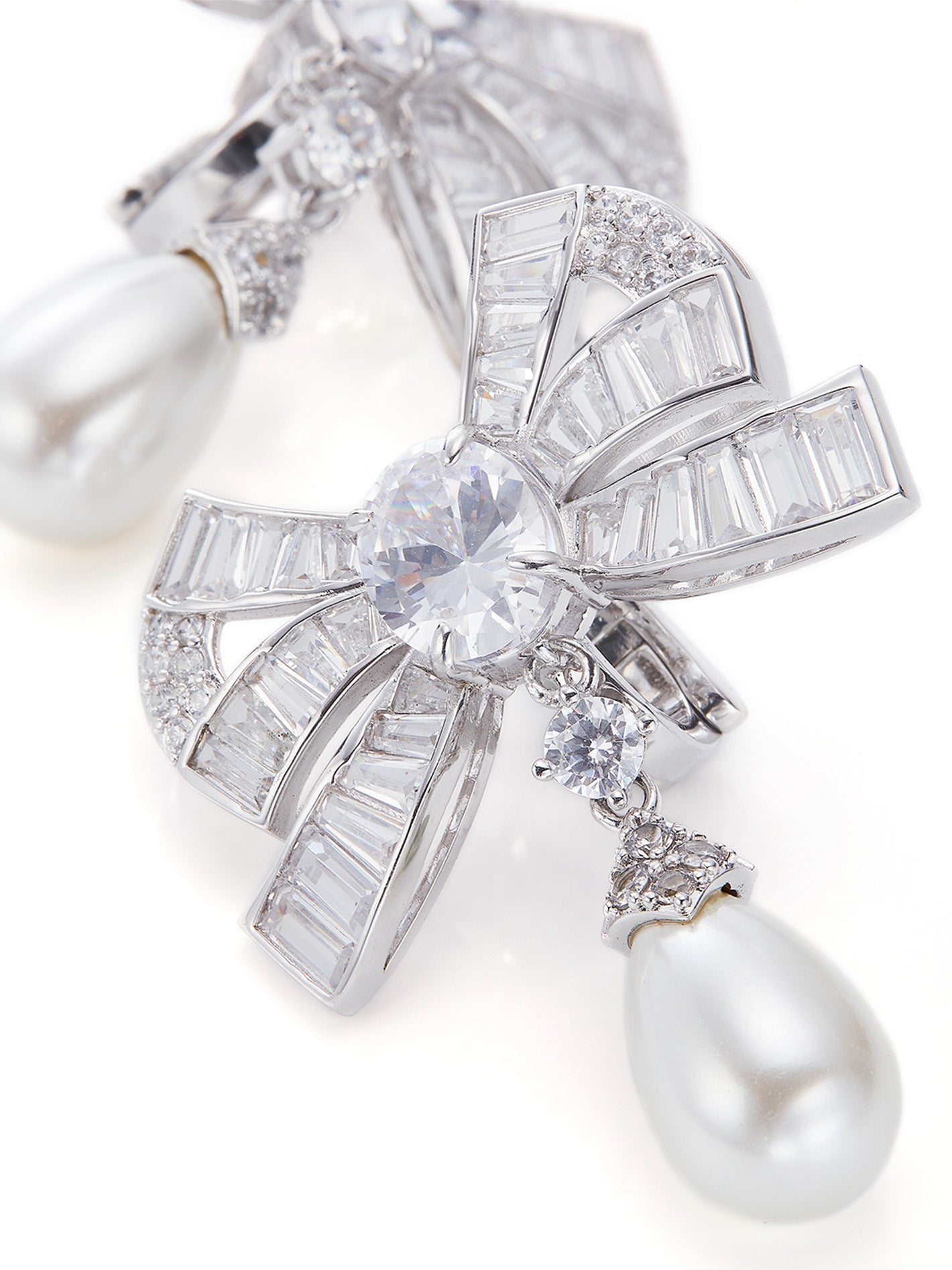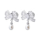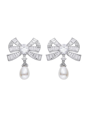 Evelyn Earrings: An exquisite bow design blending round and baguette diamonds, crowned with a lustrous drop pearl for a touch of luxury and sophistication.