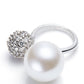 Evie Pearl Ring: A beautifully open design that contrasts a sparkling diamond sphere with a warm, elegant pearl, perfect for any occasion.